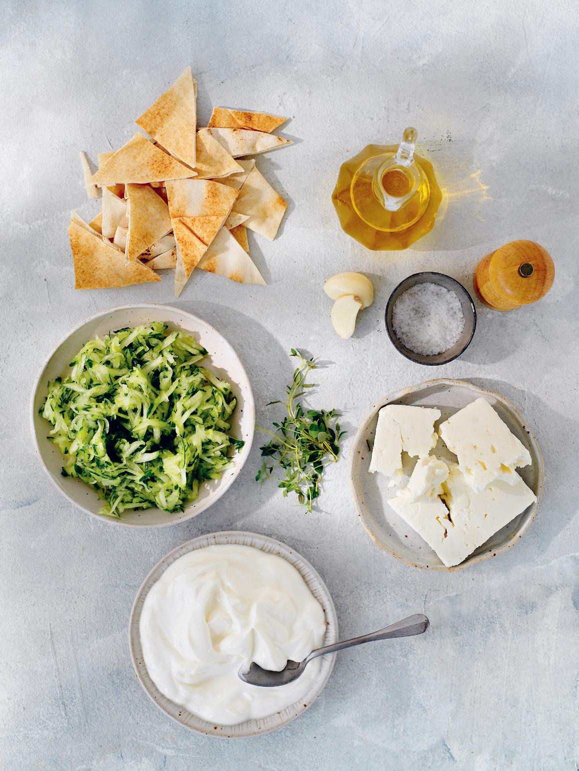 Riv gurkan och krama ur vätskan ordentligt. Blanda den urkramade gurkan med fetaostyoghurten. Skala och pressa vitlöken och rör ner i såsen. Salta och peppra. Avsluta med att ringla över olivolja och garnera eventuellt med färsk timjan.