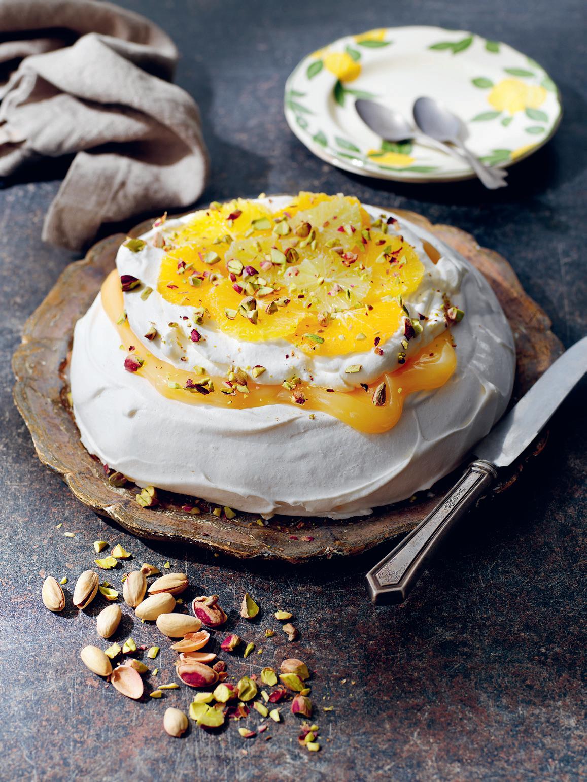 Seg och frasig marängbotten med len och syrlig apelsincurd i en oslagbar kombination. Toppingen kan du så klart variera efter säsong – byt citrusfrukterna till färska jordgubbar på sommaren.