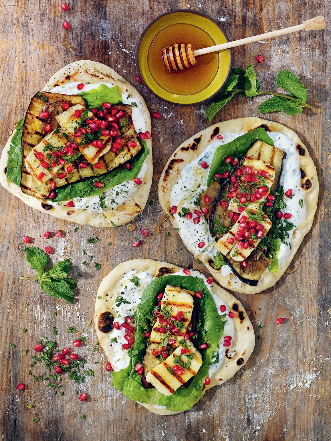 Fyll bröden med vitlökssås, sallad, aubergine och halloumi. Toppa med granatäppelkärnor, honung och mynta.