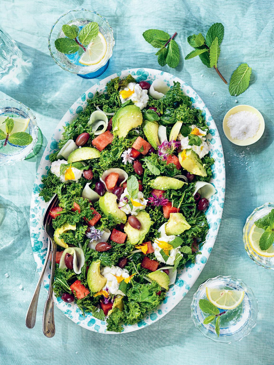 6. Blanda grönkål, kålrabbi, melon, lök, oliver och mynta på ett fat. Klicka på fetayogurtkrämen och garnera med myntablad. Halvera och gröp ur avokadon. Lägg bitarna på salladen och servera.