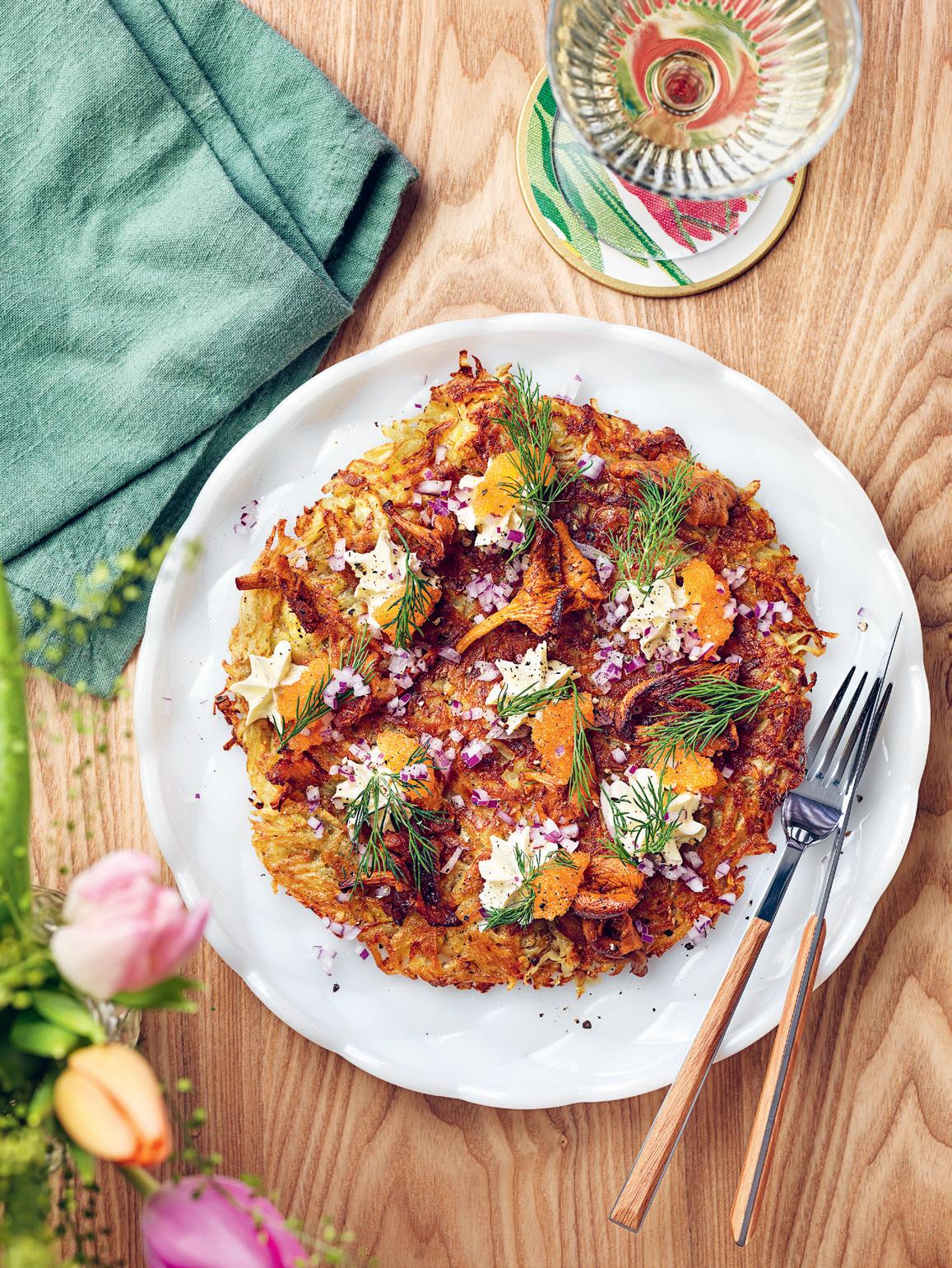 3. Värm upp en stekpanna med olja och en klick smör, Tryck ut potatisen i ett tunt lager. Stek på medelvärme i 4–5 minuter på varje sida.