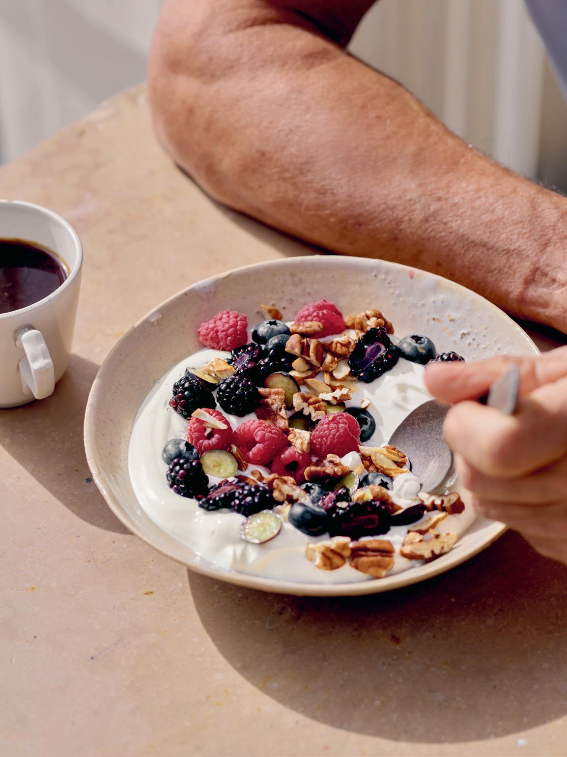 Jag får ofta frågor om min standardfrukost, och här är den. Med massor av växter och en probiotisk boost från kefiren är den mitt favoritsätt att starta dagen. Betrakta ingredienserna jag har valt som förslag, och ta de frukter, nötter och frön som du gillar. Färska bär är inte alltid i säsong, så jag tar som regel frysta, de har en massa smak och några av de där regnbågsfärgerna, samtidigt som de innehåller viktiga polyfenoler och näringsämnen.