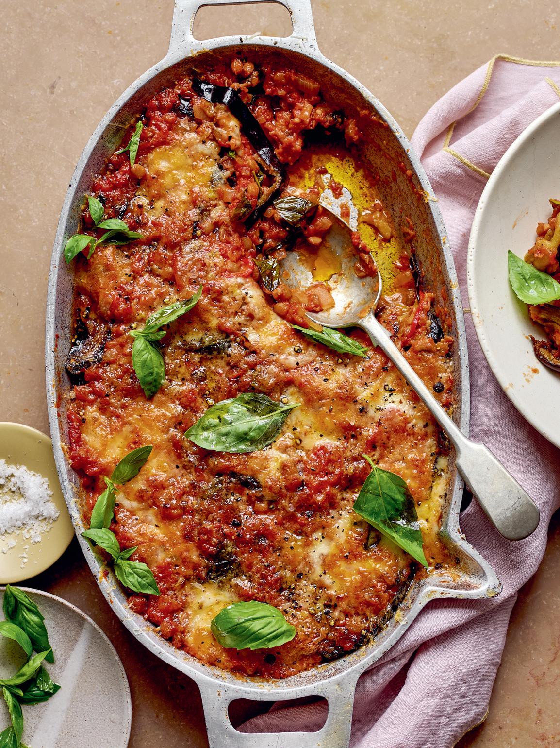 1. Sätt ugnen på 200 grader över och undervärme eller 180 grader varmluft och klä en ugnsplåt med bakplåtspapper. Lägg ut aubergineskivorna i ett jämnt lager, krydda med salt och peppar och ringla 1 matsked olivolja över. Baka i ugnen i 25 minuter tills de har fått färg och mjuknat.