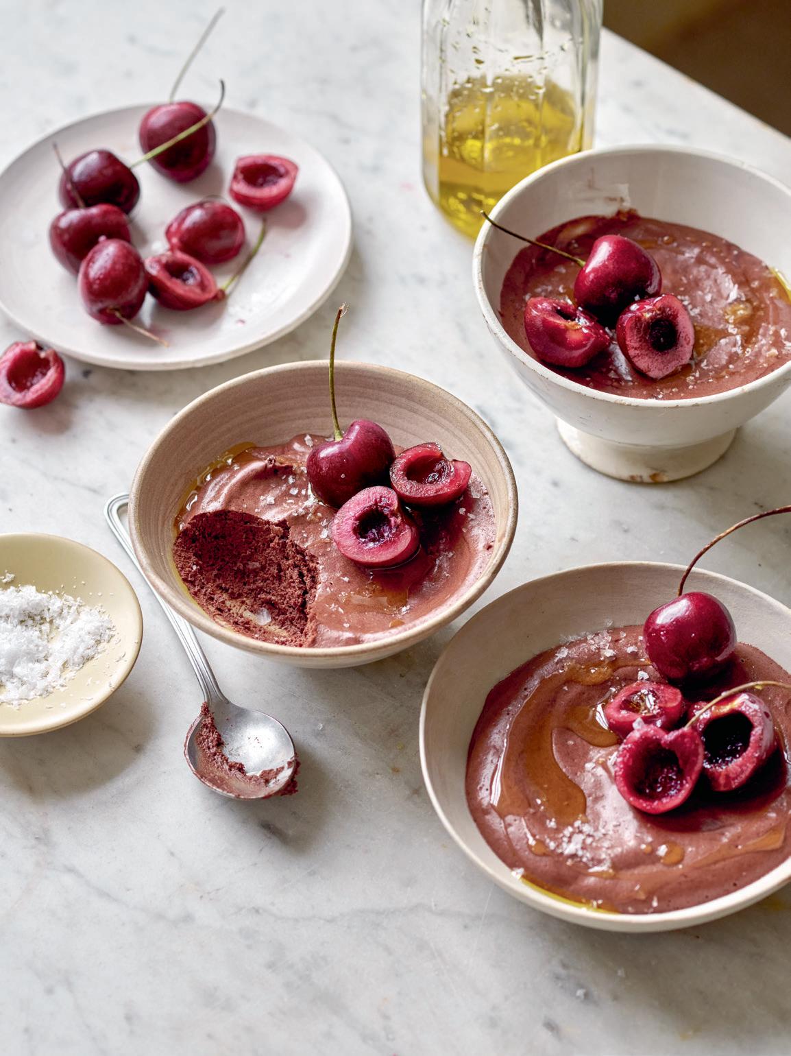 4. Skeda upp i fyra små glas och låt stå i kylskåpet i minst 1 timme. Garnera med körsbär, lite ringlad olivolja och en nypa salt.