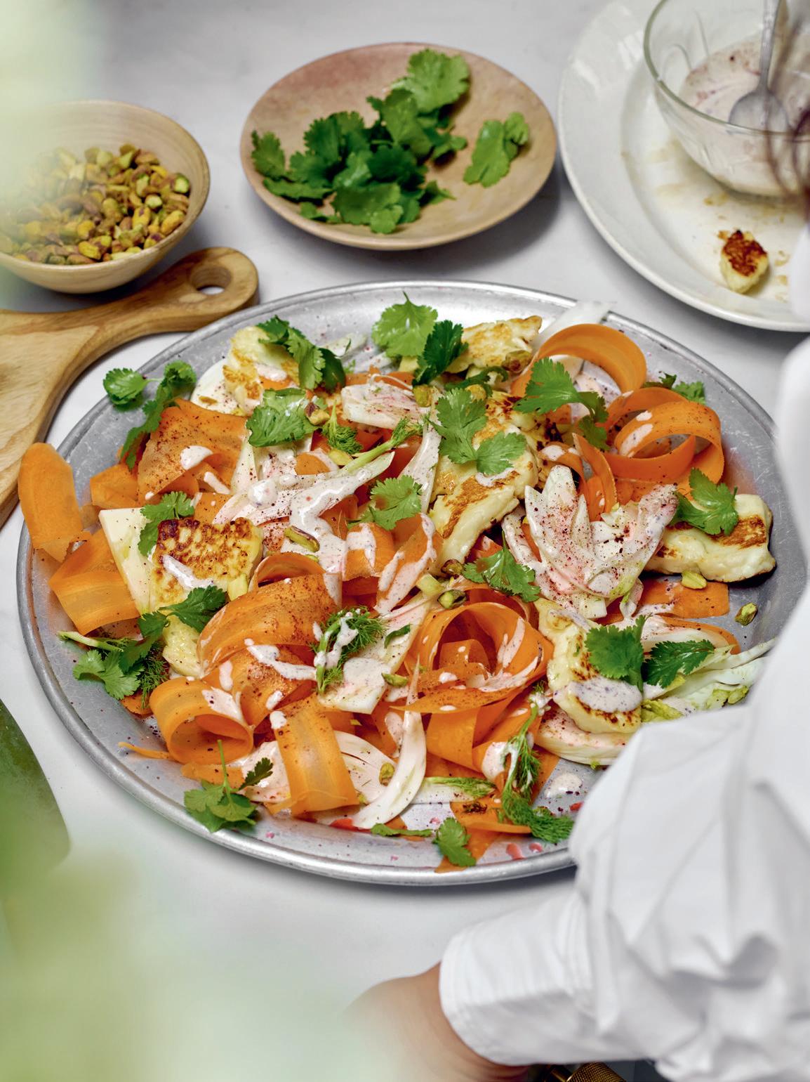De varma nyanserna på moroten och fänkålen dressade i kefir gör den här salladen till ett blickfång – lika vacker som god. Sumak och apelsin ger en ljuvlig citrussmak och när min favorit, blodapelsin, är i säsong passar den extra bra. Använd gärna tofu istället för halloumi som ett veganskt alternativ.