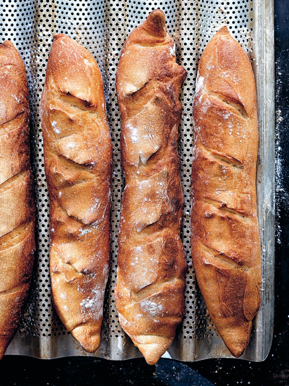 Ställ in plåten i mitten av ugnen och häll genast ut en kopp vatten på den nedre plåten. Stäng snabbt ugnsluckan och sänk värmen till 200 grader. Öppna ugnsluckan och släpp ut ångan efter 15 minuter. Grädda baguetterna i sammanlagt 20 – 25 minuter eller tills innertemperaturen är 98 grader. Ta ut dem och låt svalna på galler.