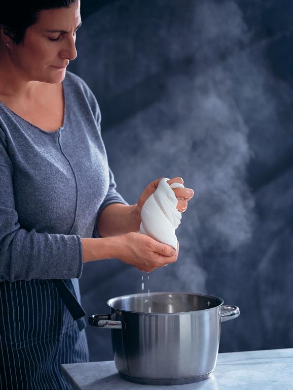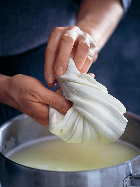 Skär ostmassan i kuber (se sidan 136), cirka 2 × 2 cm, och låt stå i cirka 10 minuter tills kuberna har separerat något från varandra. Värm sedan mycket långsamt på låg värme tills vasslen är 40 grader. Vrid försiktigt på kastrullen då och då för att fördela värmen. När vasslen har rätt temperatur, rör om försiktigt i några minuter. Lyft med en hålslev över ostmassan till ett durkslag och låt rinna av i cirka 15 minuter eller tills det inte längre droppar vassle. Tryck försiktigt på ostmassan för att få ut ytterligare vassle. Spara både vasslen i kastrullen och den som har runnit av och mät upp (väg) den. Sila sedan ner den i en ren kastrull så att inga rester av ostmassan kommer med. Blanda ner saltet i rätt mängd.
