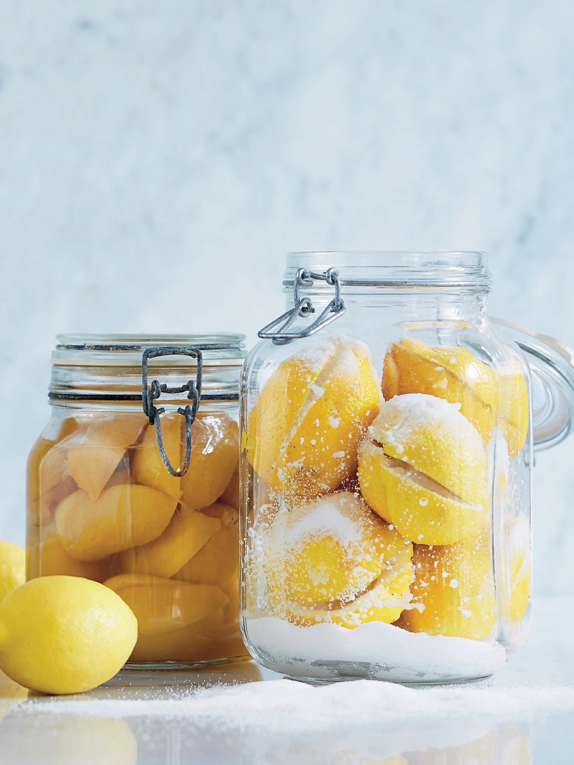 Skrubba citronerna rena. Skär bort den lilla hårda delen där stjälken har suttit. Skär ett kryss i den andra änden nästan hela vägen ner men utan att skära igenom helt (det ska bli fyra klyftor som sitter ihop nedtill). »Fyll« varje citron med 1 msk salt och ställ dem sedan tätt packade i en burk. Tryck ner dem ordentligt så att de släpper ifrån sig så mycket saft som möjligt. Fyll på med extra pressad citronsaft från 1 citron. Sätt på ett lock och låt stå över natten i rumstemperatur.