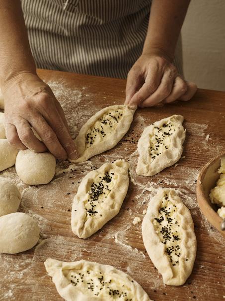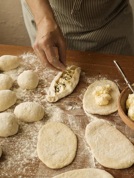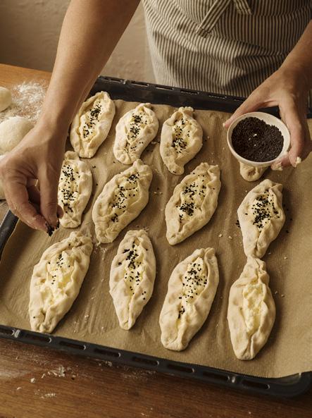 • Lägg 1–1 ½ matsked fyllning i mitten av varje degrundel. Vik upp kanterna så att degen bildar en båtform, nyp ihop lätt i ändarna men lämna fyllningen synlig i mitten. Kanterna ska vara tydligt uppvikta, så att det blir som en öppen pirog eller en liten paj, och inte platta som på en pizza.