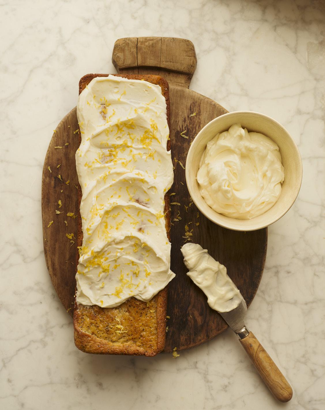 • Låt kakan svalna helt. Bred sedan på frosting och strö över citronzest.