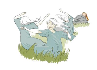 Så hörde jag plötsligt några flickor som fnittrade med ljusa röster och jag gömde mig snabbt bakom en stor sten. Från mitt gömställe kunde jag höra hur flickorna började sjunga, och jag kikade försiktigt fram.