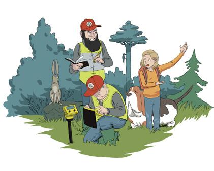 Jag följde efter honom och vi kom till en liten glänta i skogen. Och där i det höga gräset stod en man böjd över någonting och en annan stod bredvid och skrev i en bok. Jag undrade först om de kunde vara såna där tomtar som LENASLEVA hade pratat om. Men de här två hade höga gröna gummistövlar på sig, och röda kepsar på huvudet. De liknade inte alls tomtarna som min lärare hade beskrivit.