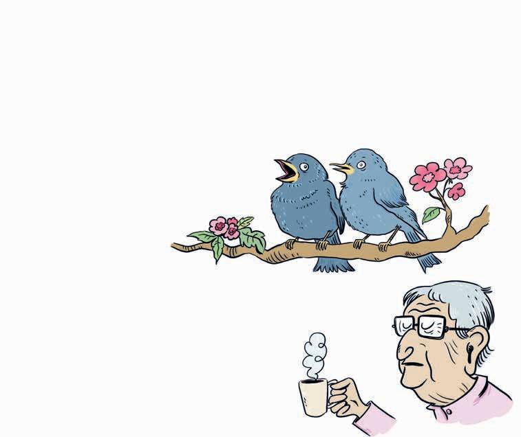 I träden sitter en massa tråkiga fåglar och kvittrar.