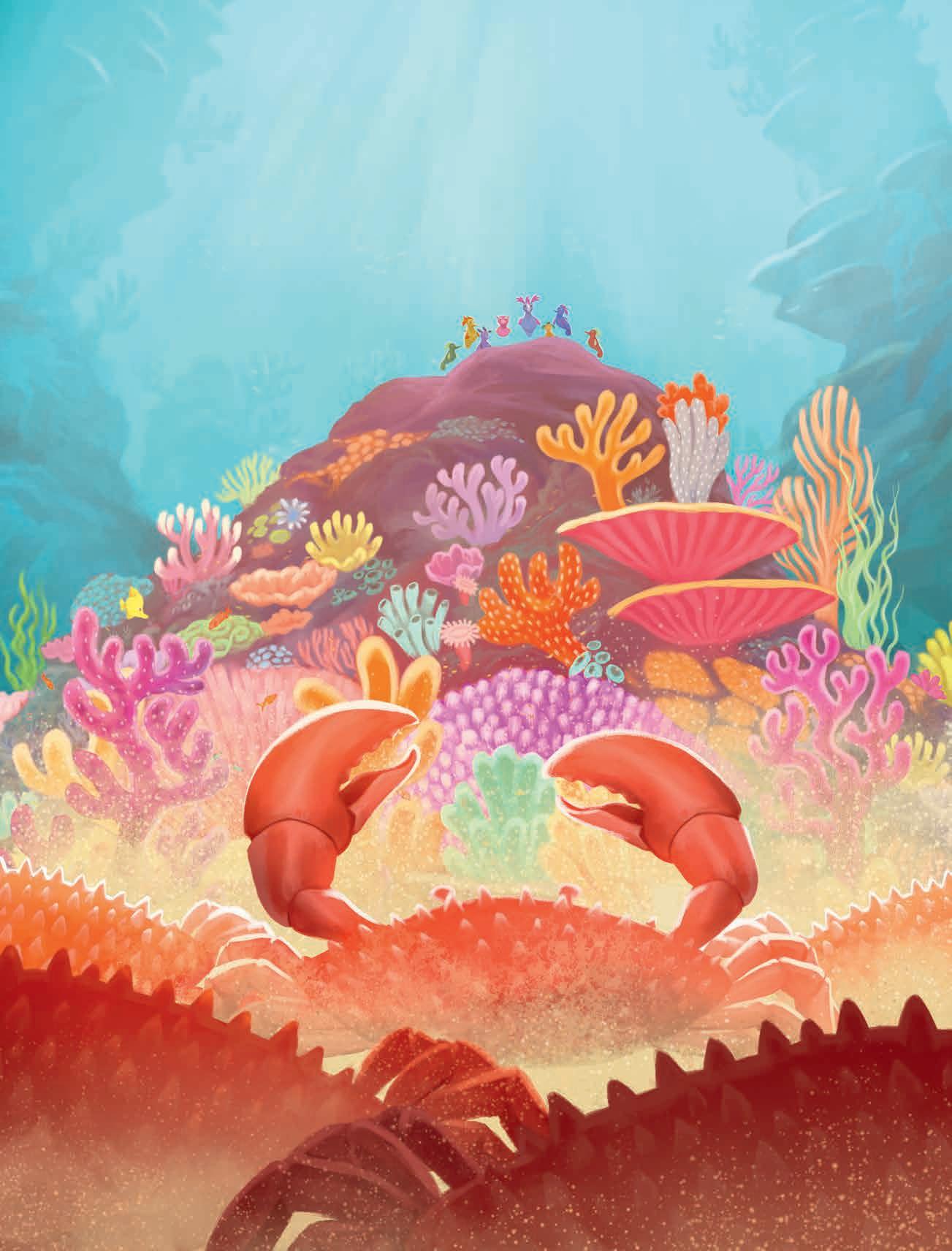 Inte förrän krabborna var alldeles nära korallrevet stannade de upp, och där blev de stående på långa led. Vanliga krabbor var ju sjöhästarna vana vid. De fanns lite varstans vid revet, och Sjönö och de andra brukade hjälpas åt att hålla koll på dem för att inte hamna i deras klor.