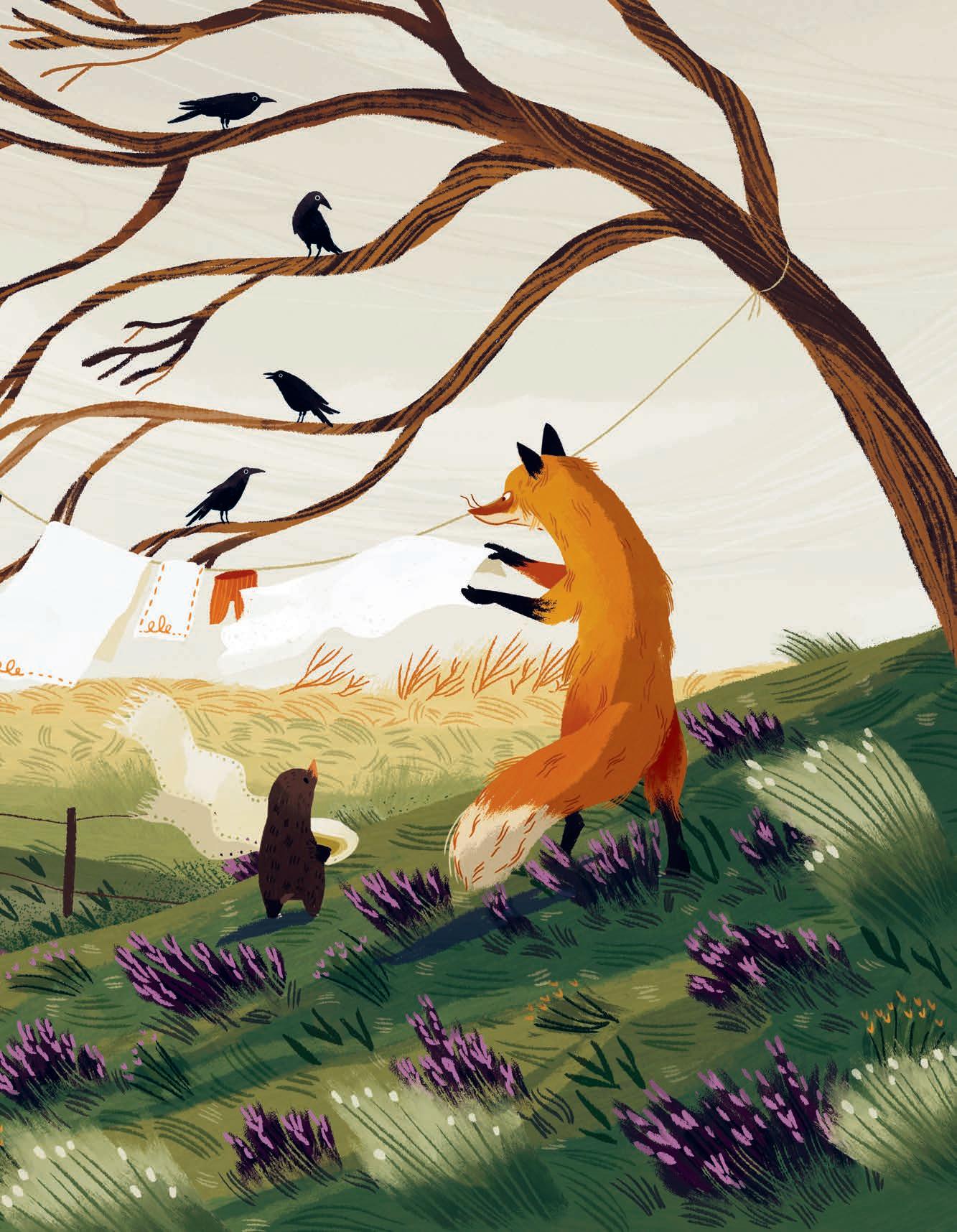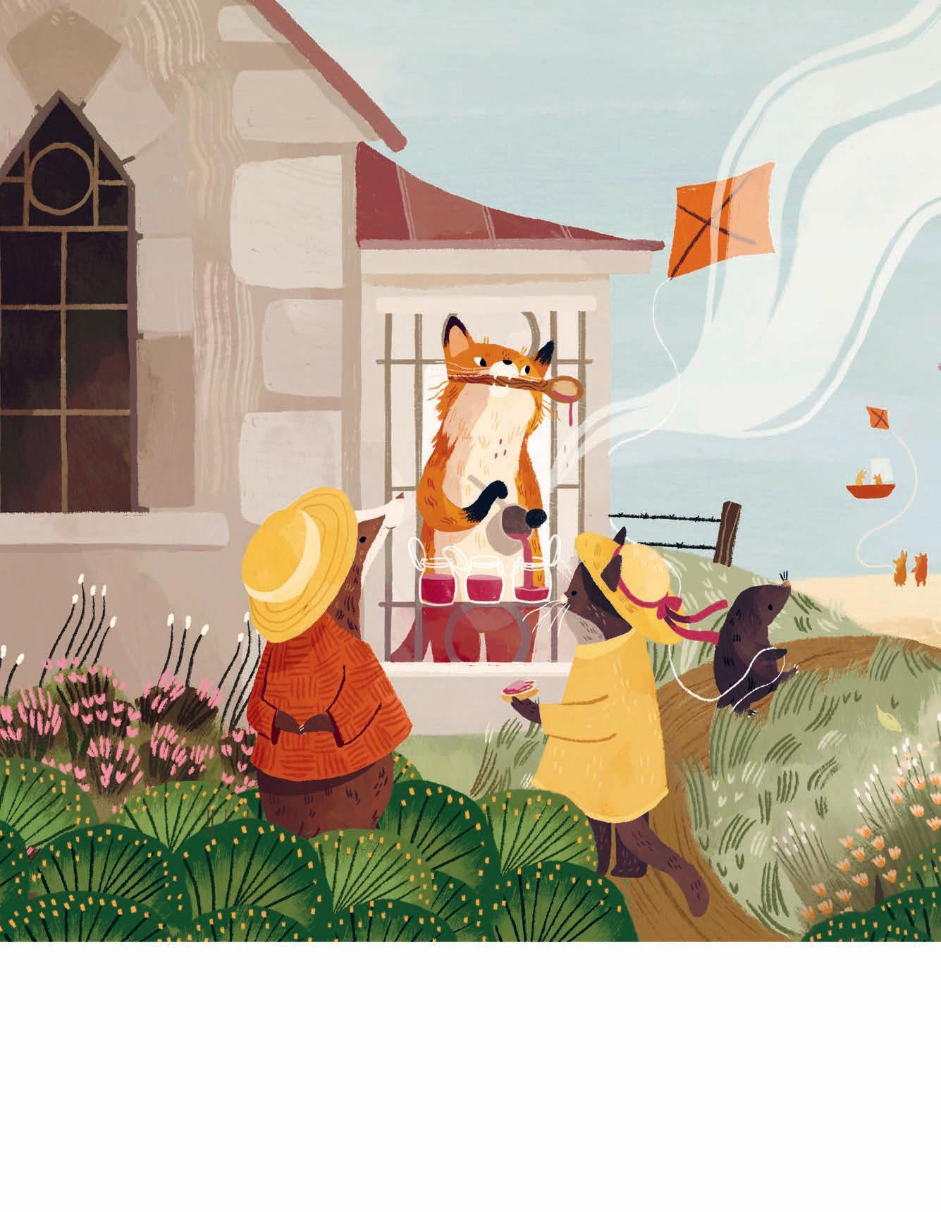 På sommaren kom gäster från stan och ög drake och badade i havet. Det var ljust och livat ända in på nätterna, och mullvaden var med på allt. Men räven hade inte tid. Den stannade uppe och bakade skorpor och kokade marmelad till alla som ville ha.
