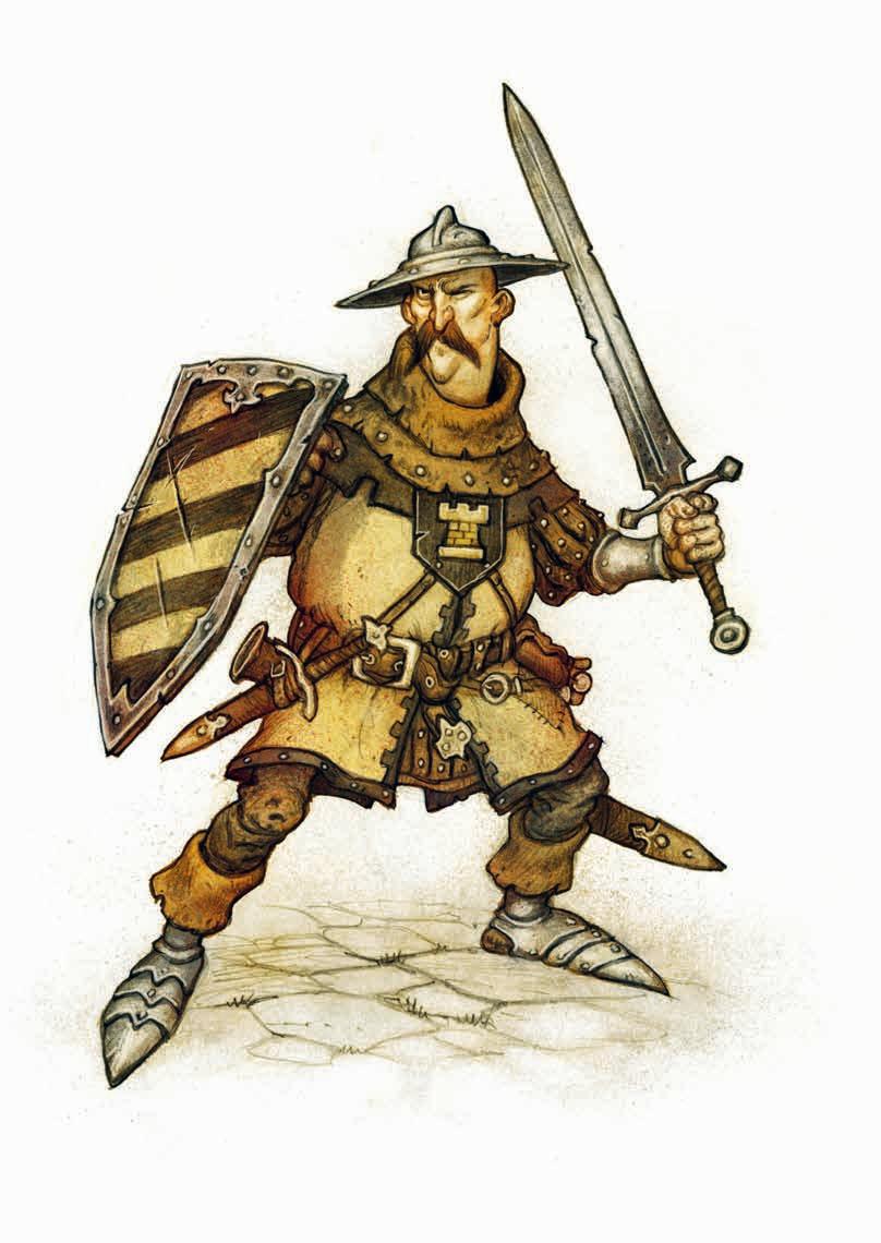 ”Vänta lite”, säger den runda stadsvakten och sliter åt sig pungen. ”Du glömde vår avgift.” Han häller ut en näve mynt innan han ger tillbaka pungen.