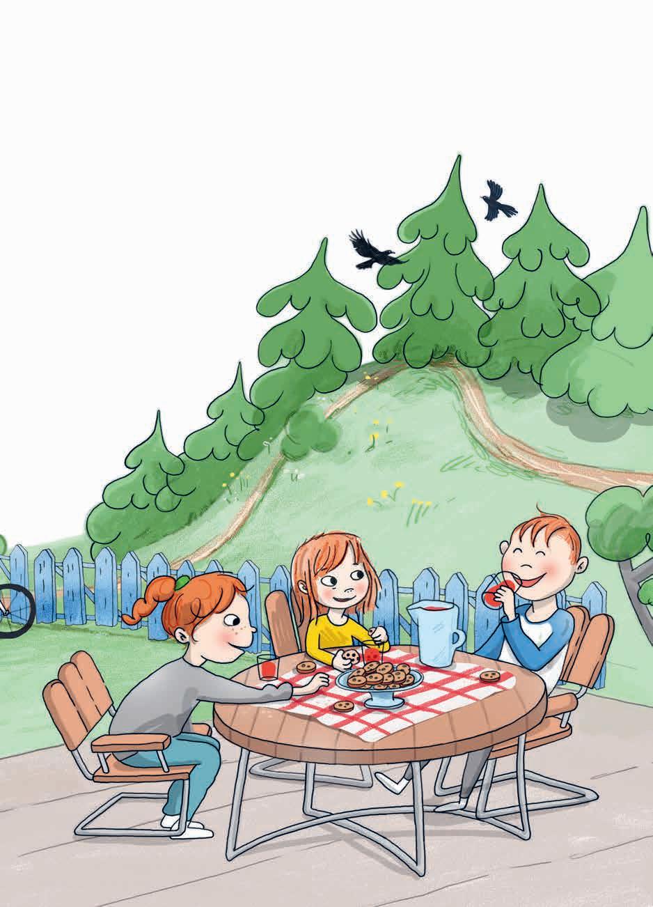 Sagas stora kusiner Albin och Alba och deras föräldrar har cyklat till gladhuset på Solrosvägen.