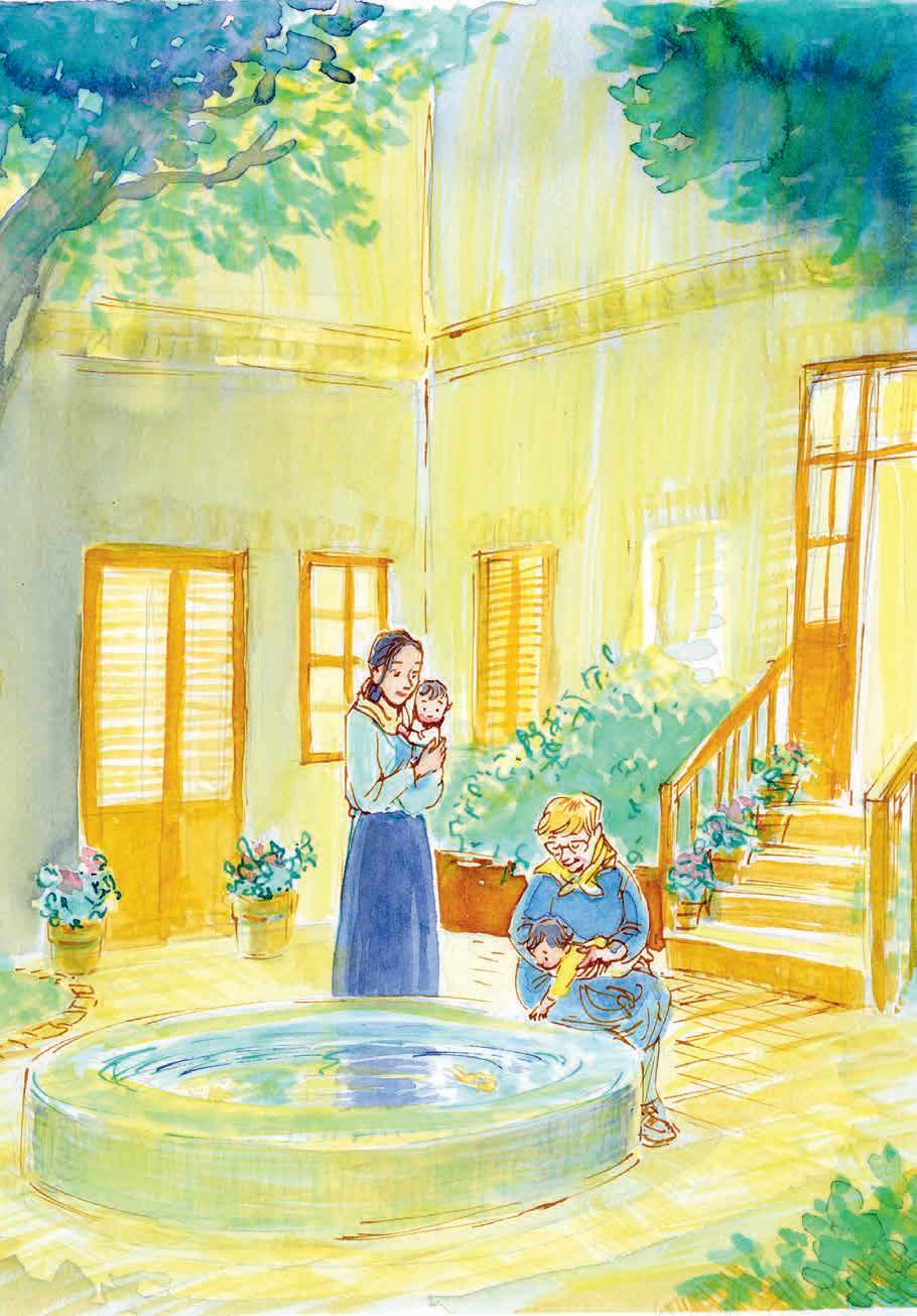 â Ă h, vad vackert, sĂ€ger Lena och gĂ„r fram till den lilla bassĂ€ngen i mitten av gĂ„rden.