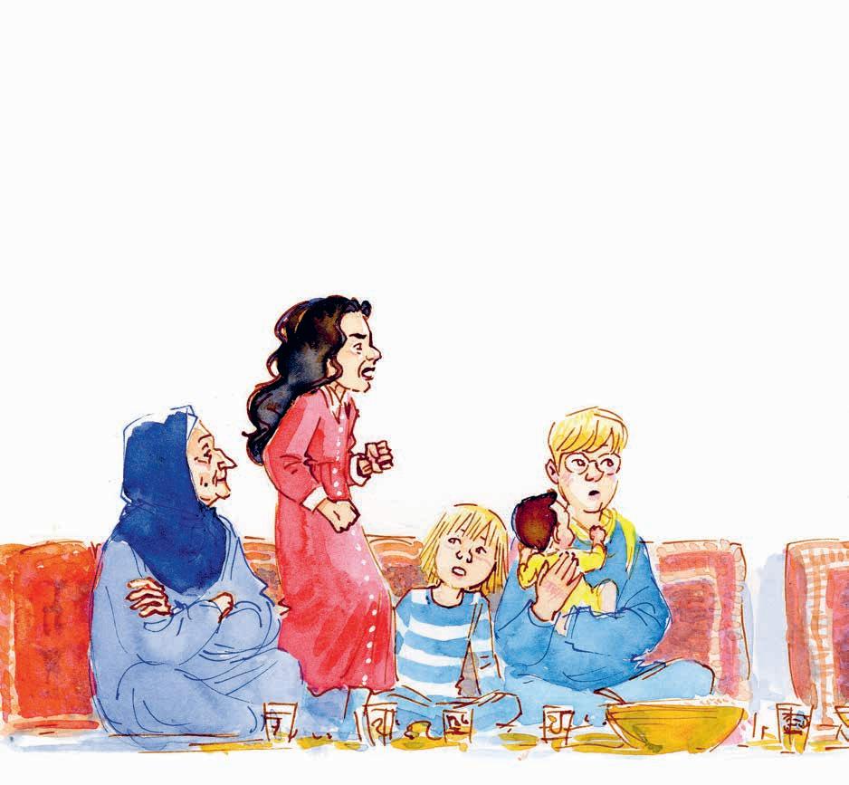 Snart blir hela duken full med sÄ mycket mat att det skulle rÀcka till en hel stad. Alla sitter runt duken med benen i kors och börjar Àta. Det syns att alla har vÀldigt trevligt. Lena Àr den enda som inte kan persiska, sÄ Mani översÀtter sÄ mycket han hinner. Isabell kan inte lika mycket persiska som Ida, men hon förstÄr ganska bra om det inte pratas för fort.