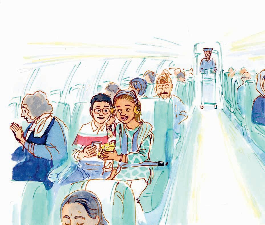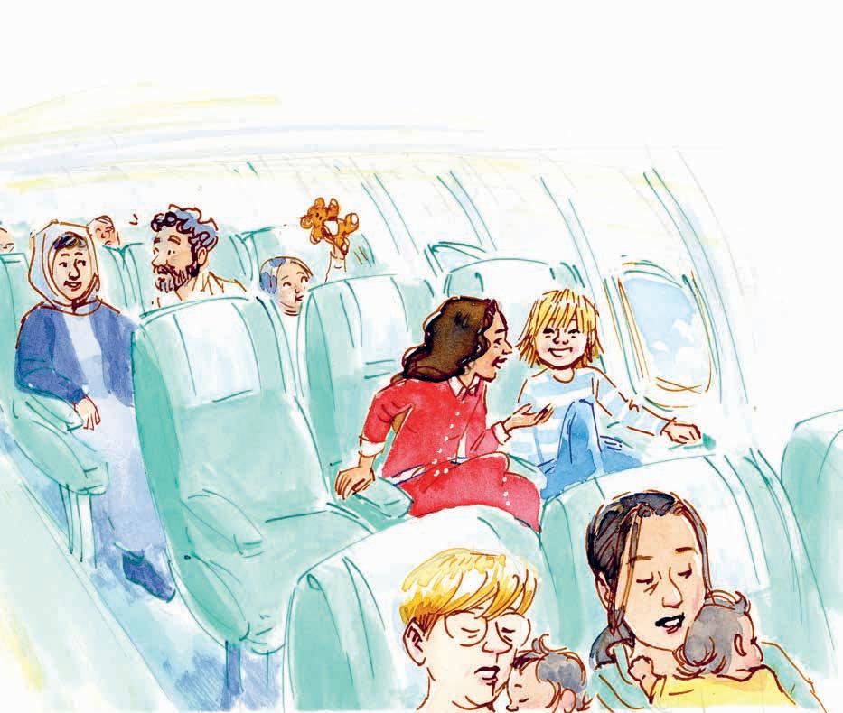 Det Àr mÄnga som ska Äka till Iran. Maryam hör persiska överallt pÄ flygplatsen. Det Àr en hÀrlig kÀnsla. NÀstan ett helt flygplan med resenÀrer som pratar persiska. Hon kramar sin pappa och pussar honom hÄrt pÄ kinderna.