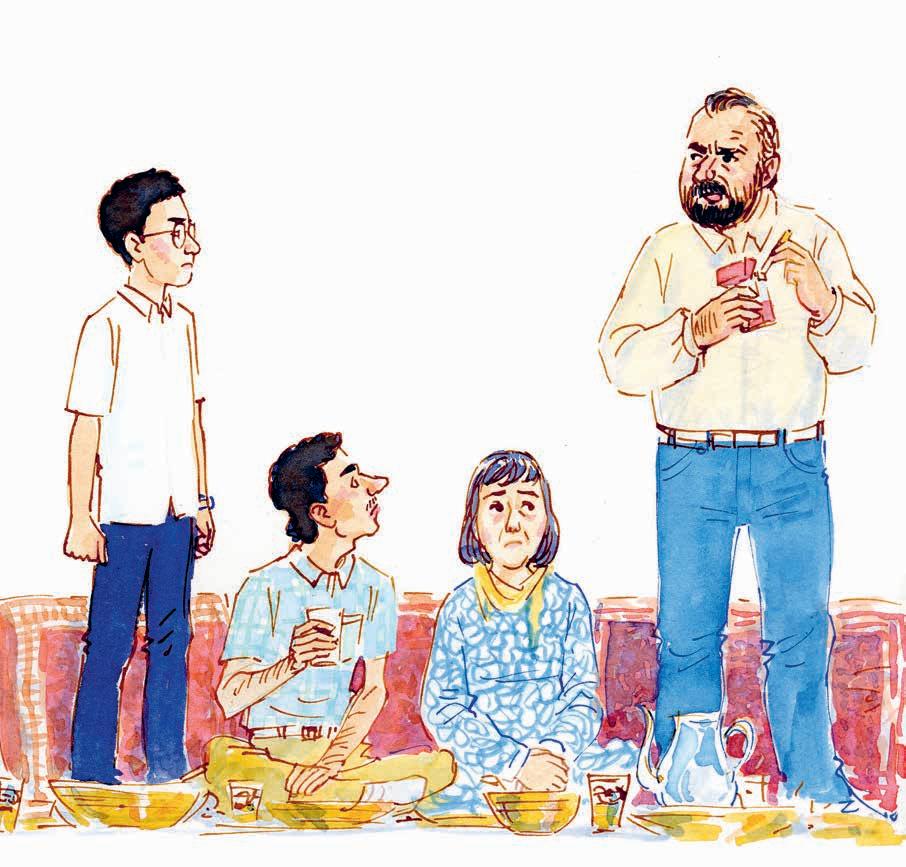 reser sig Nasser, moster Azins man, upp och tackar för maten.