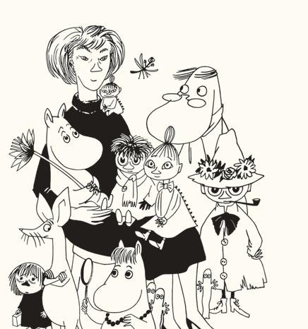 Tove Jansson och några av gurerna i Mumindalen.