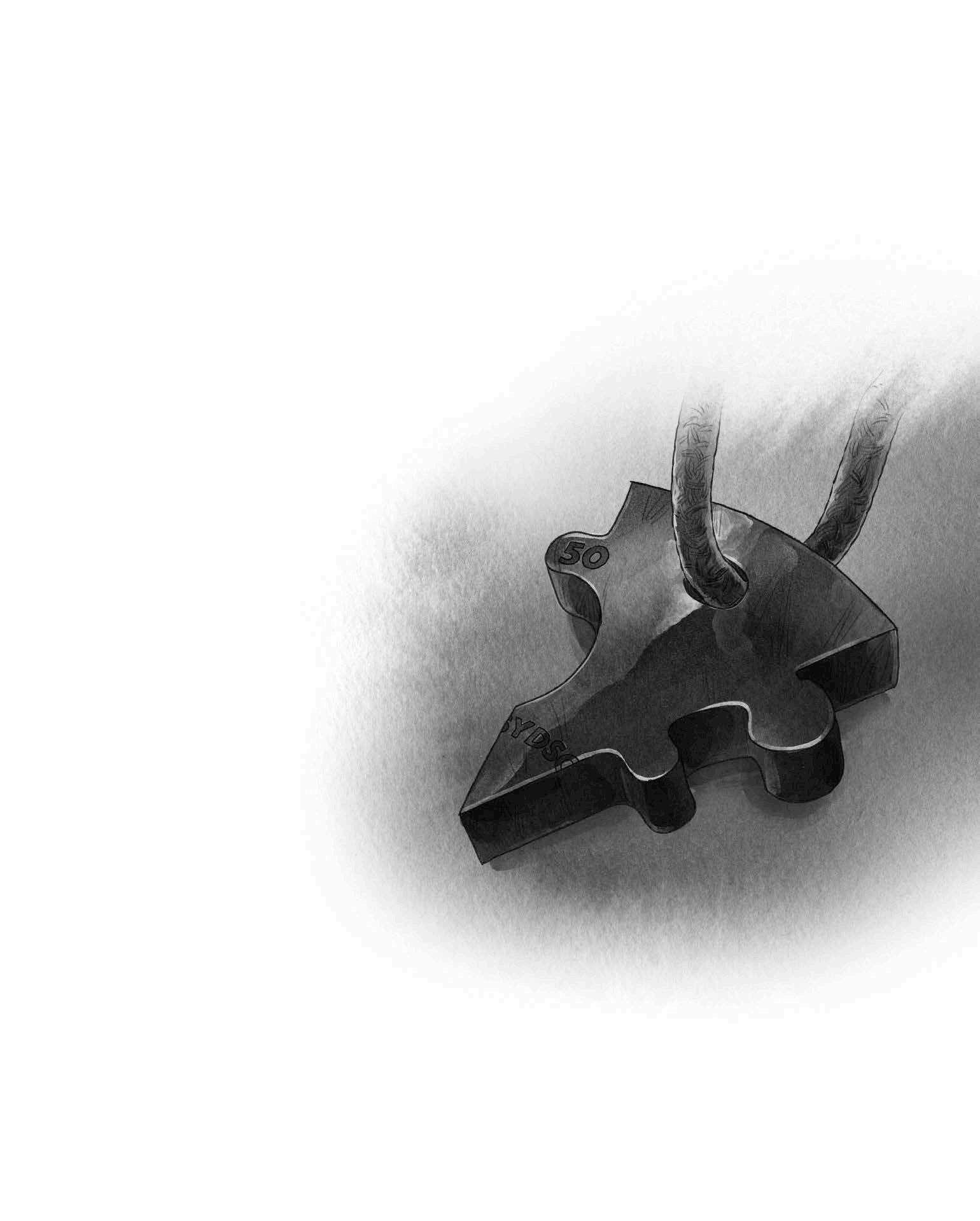 Den svarta marmorbiten, som hade delar av siffror och symboler inetsade med laser, hängde nu i en snodd runt Cruz hals. Stenen hade formen av en tårtbit och var inte bredare än ett par centimeter längs den rundade kanten. Den såg ut som en pytteliten pusselbit från ett runt pussel.