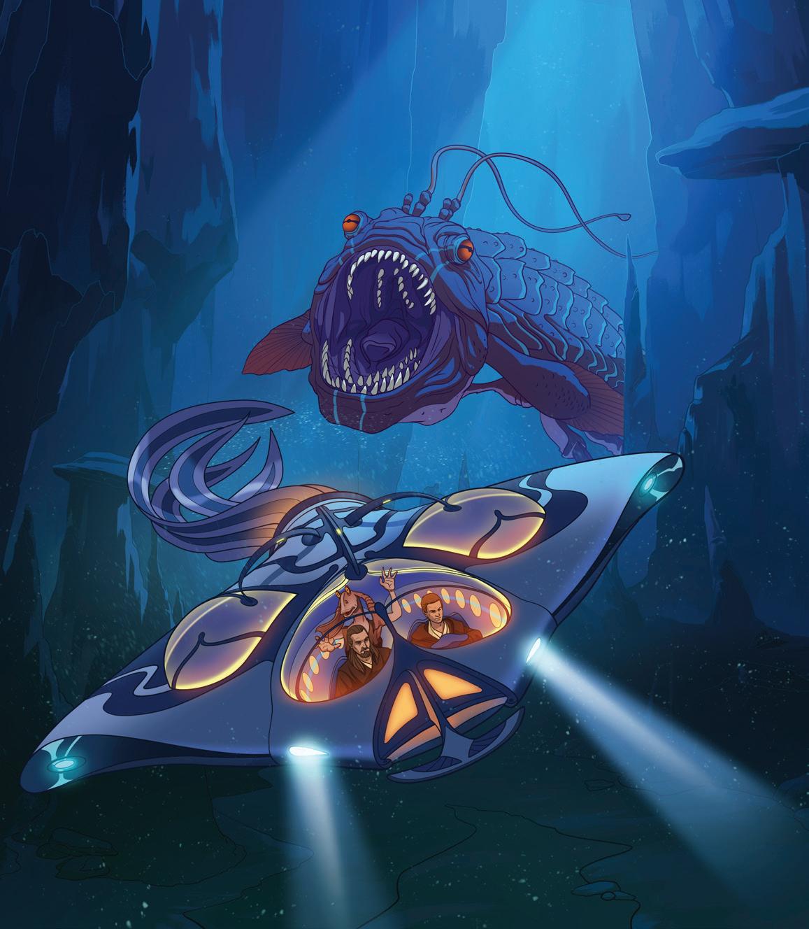 Gunganerna ger Qui-Gon och Obi-Wan en ubåt. De måste färdas genom planetens kärna för att rädda drottning Amidala, som hålls fången i Naboos huvudstad. Obi-Wan är en skicklig pilot och lyckas undkomma det livsfarliga havsmonstret!