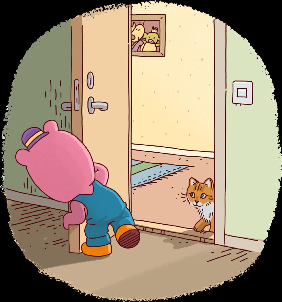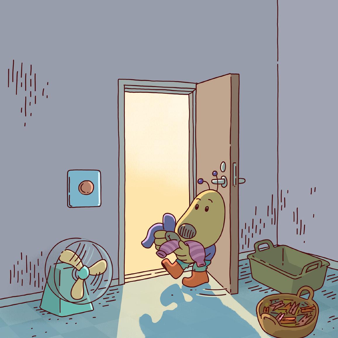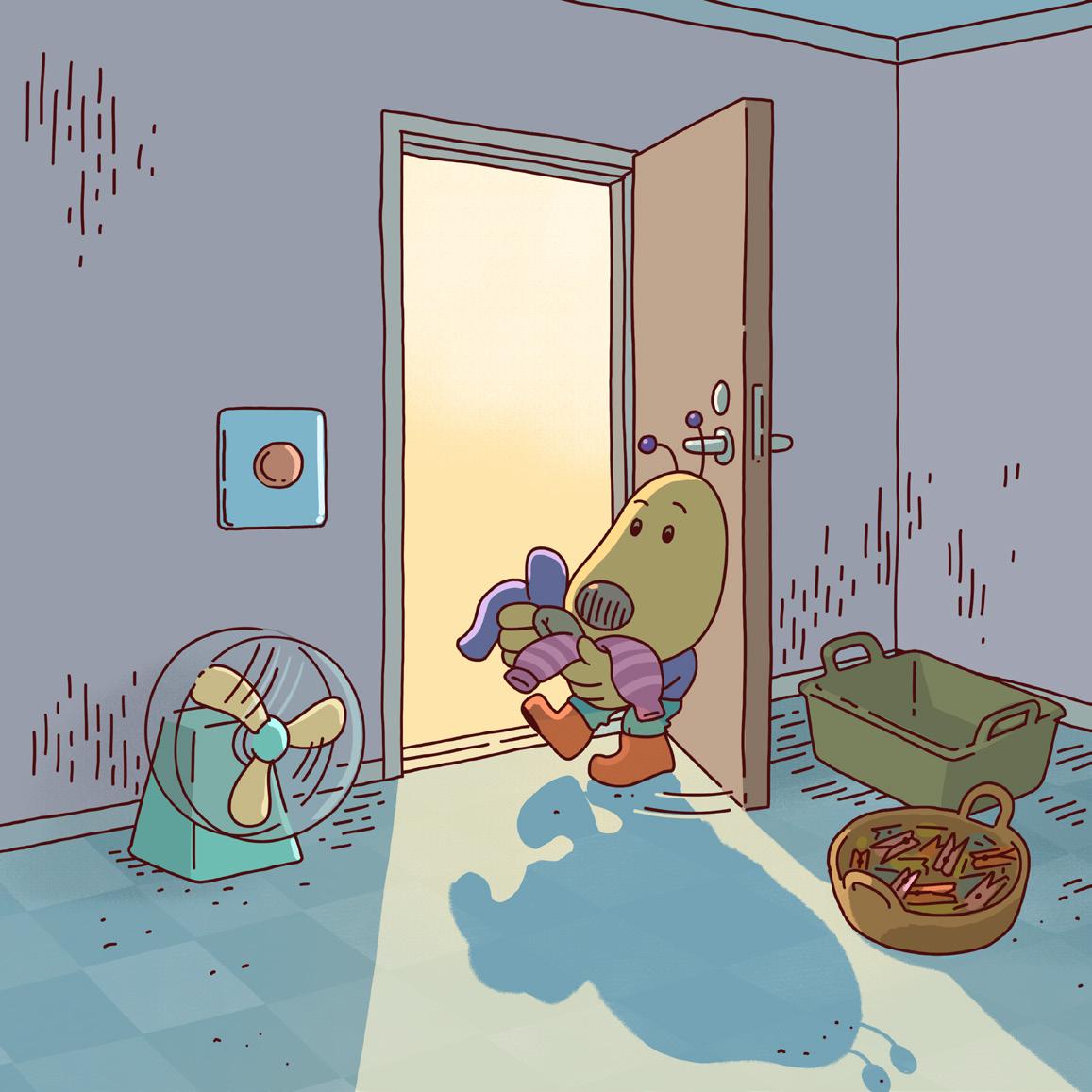 När Mim öppnar dörren ser han inget. Det är mörkt! Han känner med handen efter lysknappen. Där!