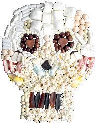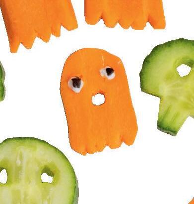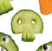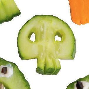 Champinjoner blir bästa dödskallarna! Dela en champinjon på hälften och gröp ur ögon och skär skåror för näsa och mun med en matkniv.
