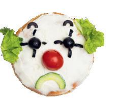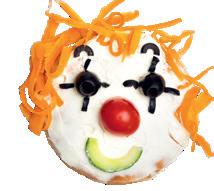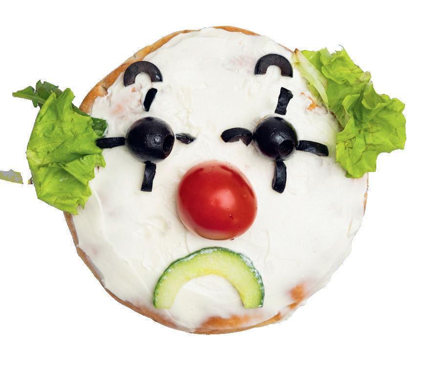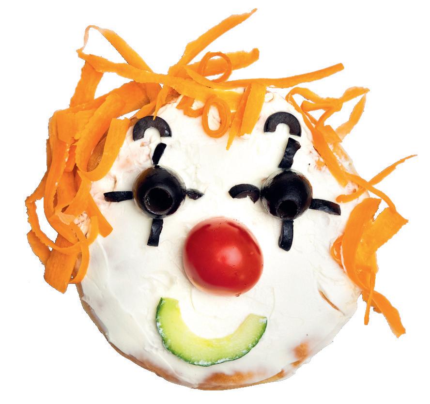 1 Täck hela ansiktet med vit färskost. En körsbärstomat är den perfekta clownnäsan, rund och knallröd.