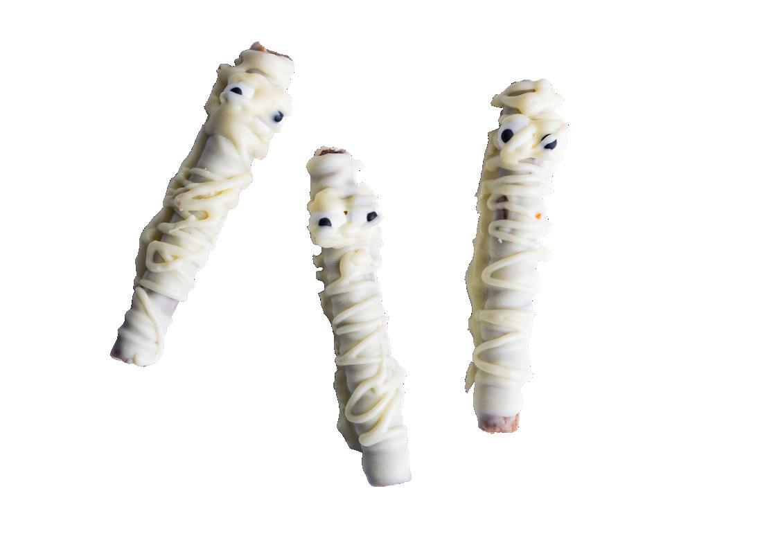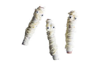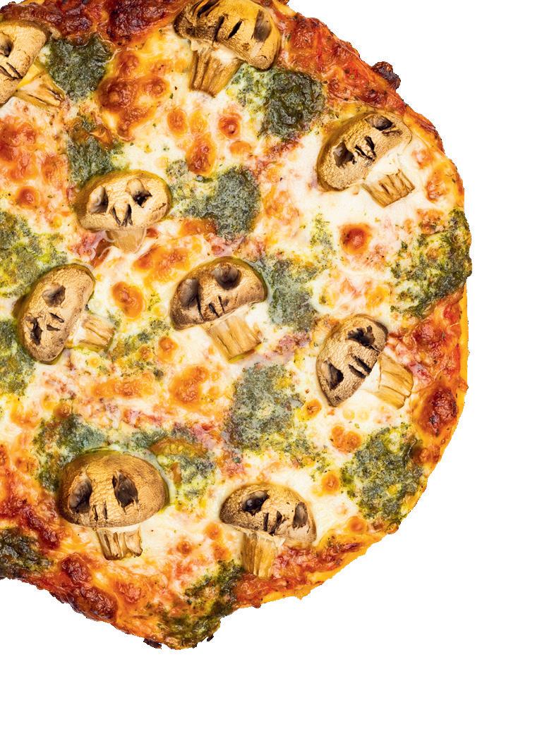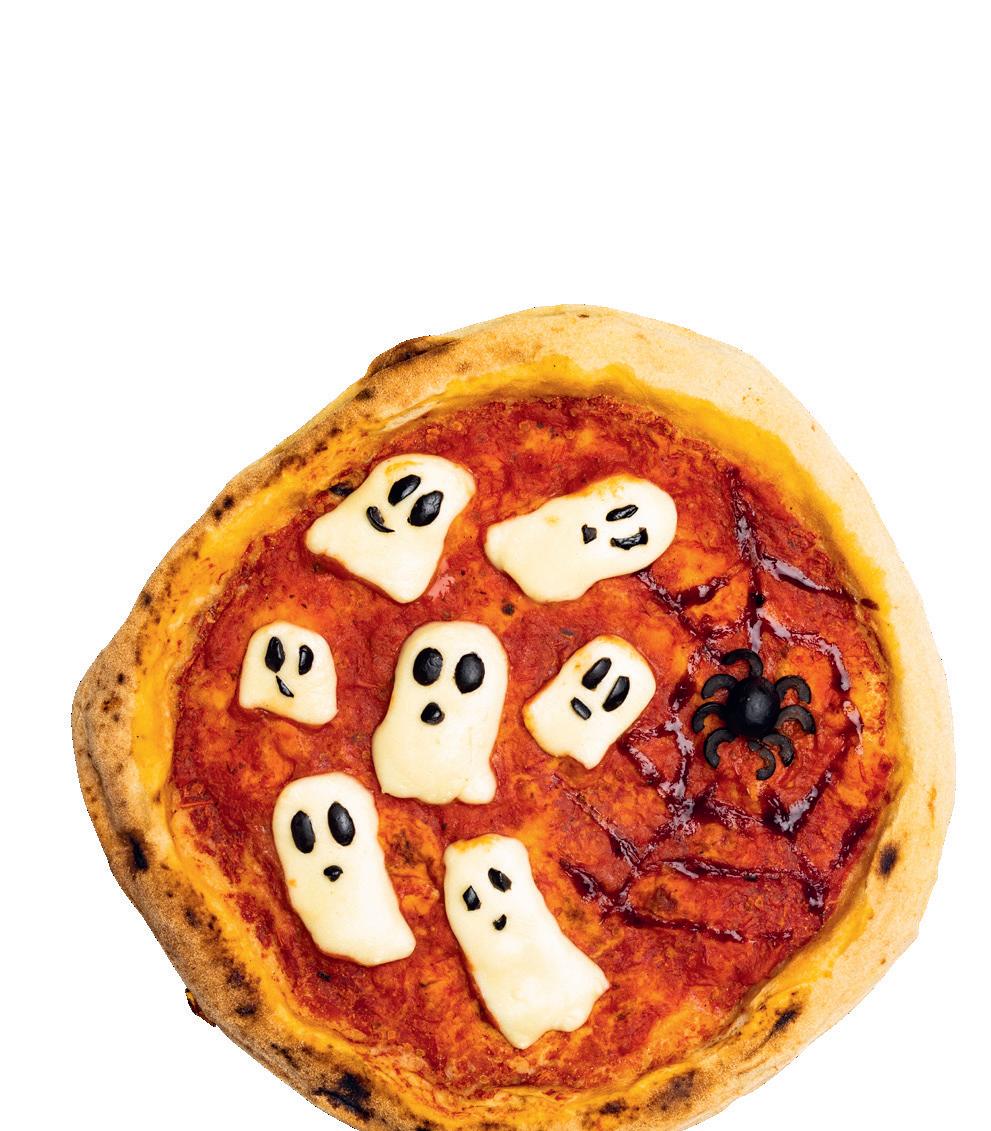 För att inte osten ska smälta för mycket, lägg på spökena när pizzan nästan är färdiggräddad och skjutsa in en kort stund till i ugnen.