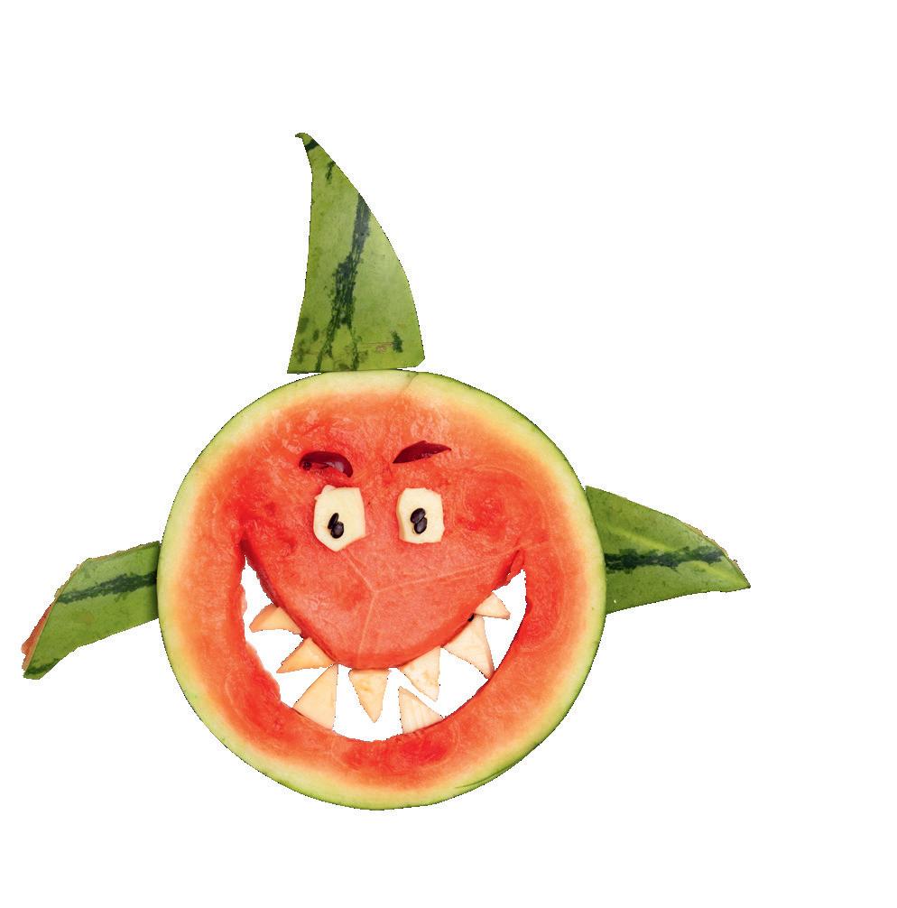 Lek med frukten! Mina vattenmelonhajar fick tänder av ananas och honungsmelon och ögonbryn av vindruvor.