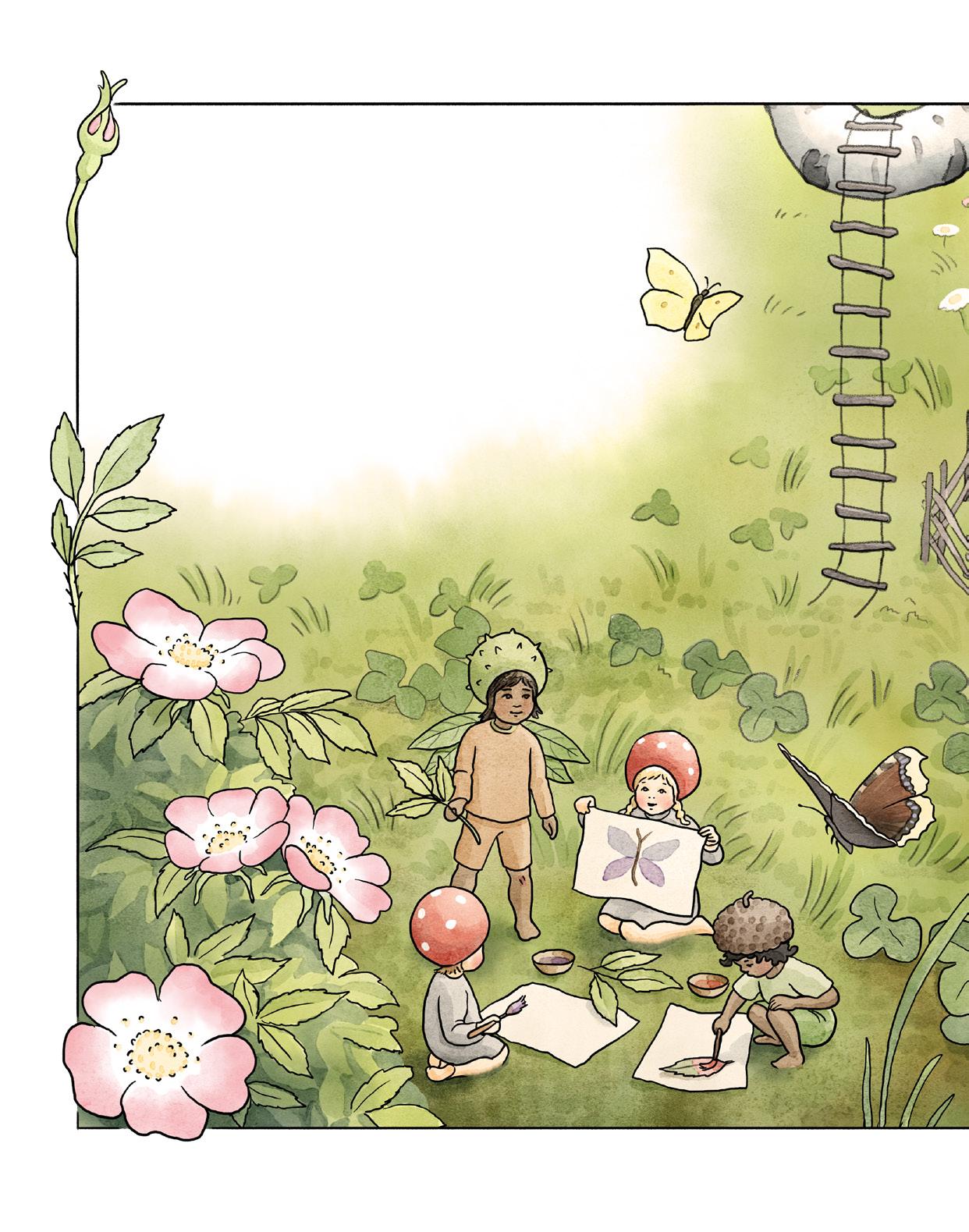 Fjärilarna fladdrar över blåsippornas gröna blad. Tomtebobarnen och deras vänner