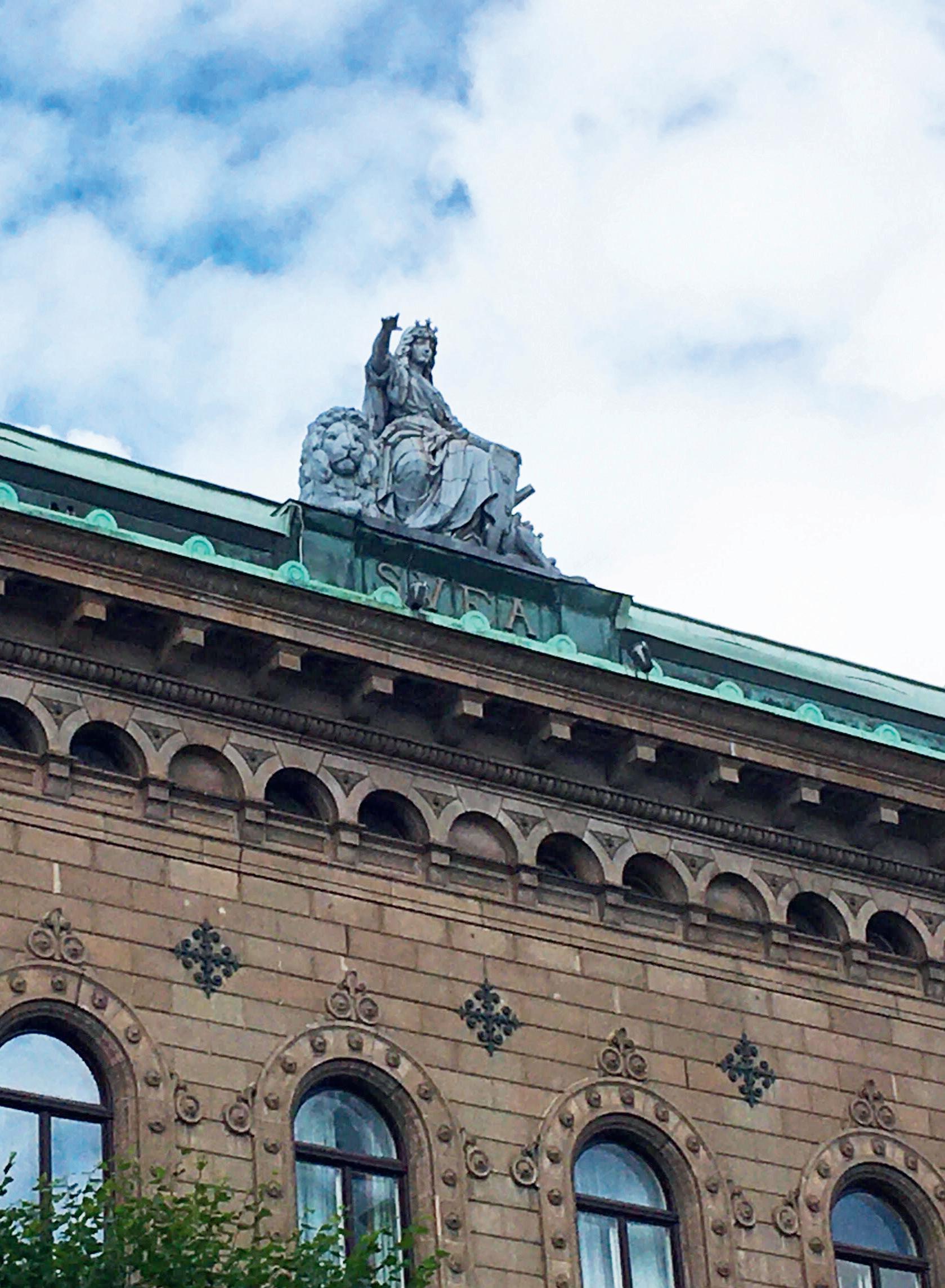 Förr i tiden hade försäkringsbolag namn som Nornan, Fylgia, Fenix, Njord – och Svea. Och mycket riktigt, Brand- och lifförsäkringsaktiebolaget Svea grundades i Göteborg 1866 och var ett av de första i sitt slag. Affärerna tycks ha gått bra för 1889 lät man uppföra en ny, stilig kontorsbyggnad på Västra Hamngatan 3 med en nationssymbol som galjonsfigur. Huset är ritat av Adolf Emil Melander och är byggt i florentinsk nyrenässans. Och takstatyn har namnet ”Moder Svea med Rikets Lejon” och är tillverkad i Berlin och är Göteborgs enda kvarvarande takstaty. Fram till andra världskriget fanns även tre bronssfinxer på takets hörn.