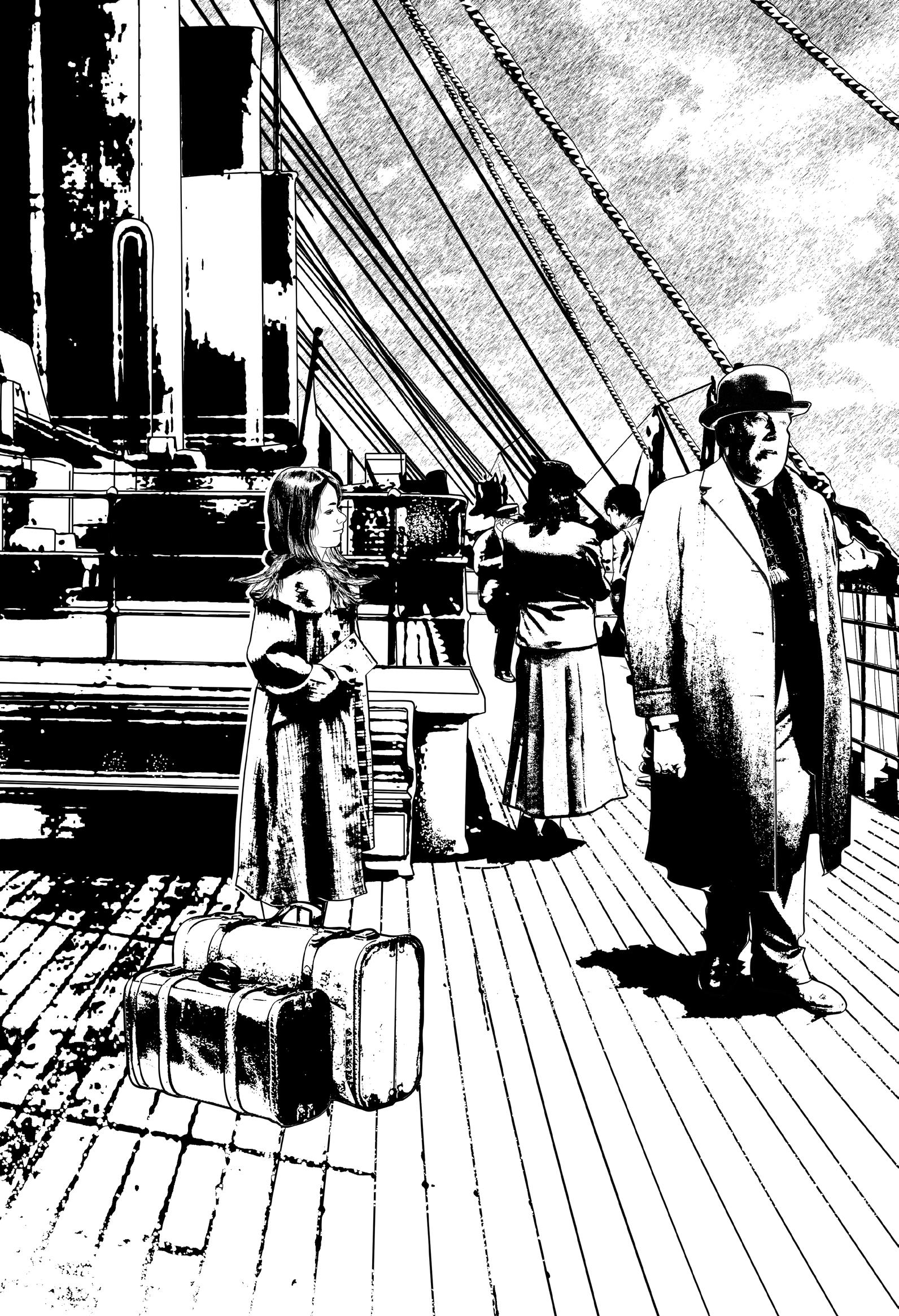 Jag följer den stora gruppen med passagerare som går ombord på fartyget och hamnar på däcket för passagerarna i andra klass. Det är kyligt, men det blåser inte. Luften luktar av salt och jag sicksackar mellan människorna för att ta mig fram till relingen.