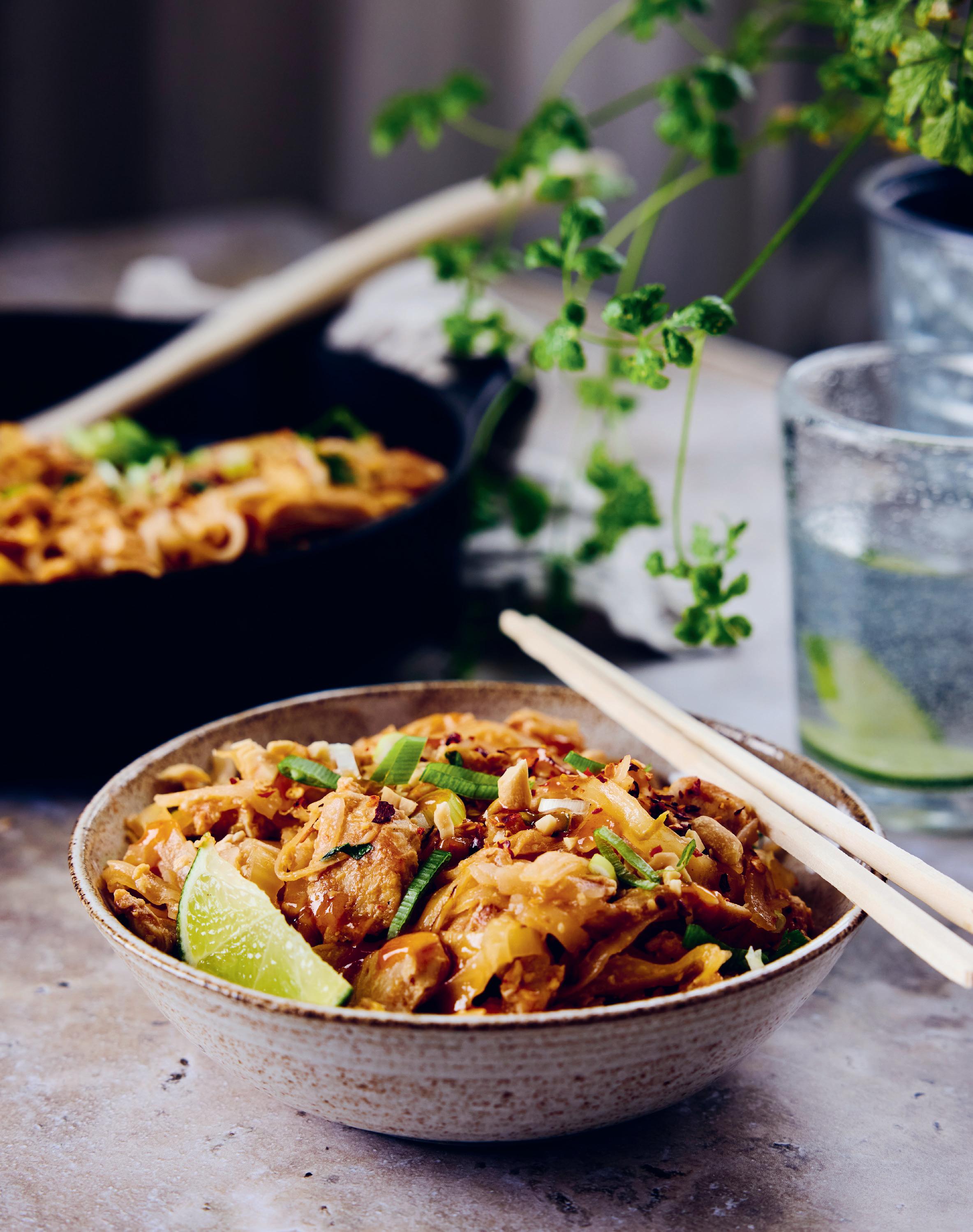 Vem älskar inte pad thai? Denna är minst lika god som en du köper ute, men med mer grönsaker, mindre fett och mindre socker. Testa att byta ut kycklingen mot räkor eller varför inte kycklingfärs!