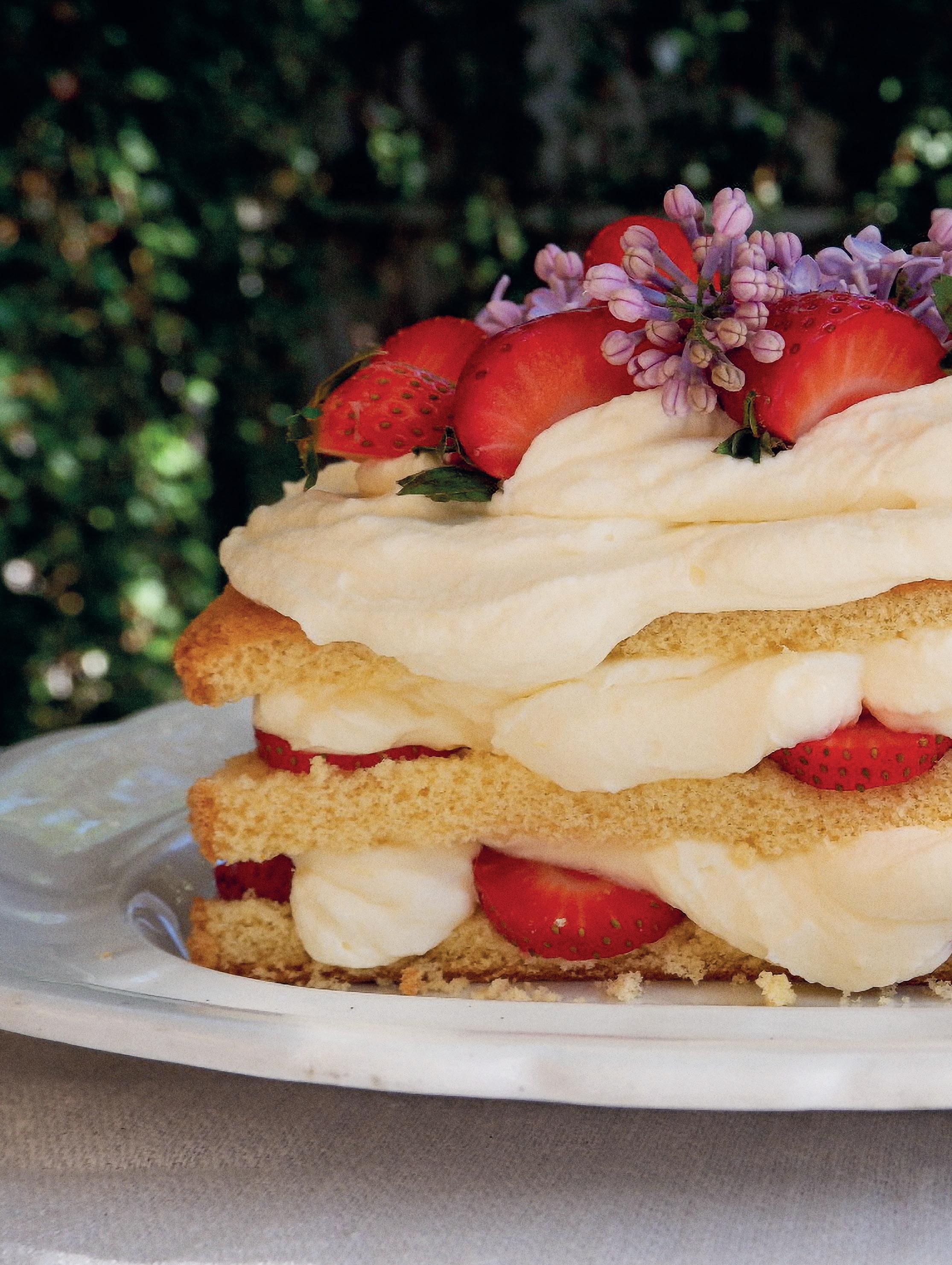 JORDGUBBSTÅRTA MED MASCARPONEGRÄDDE, CITRON OCH SYRENBLOMMA