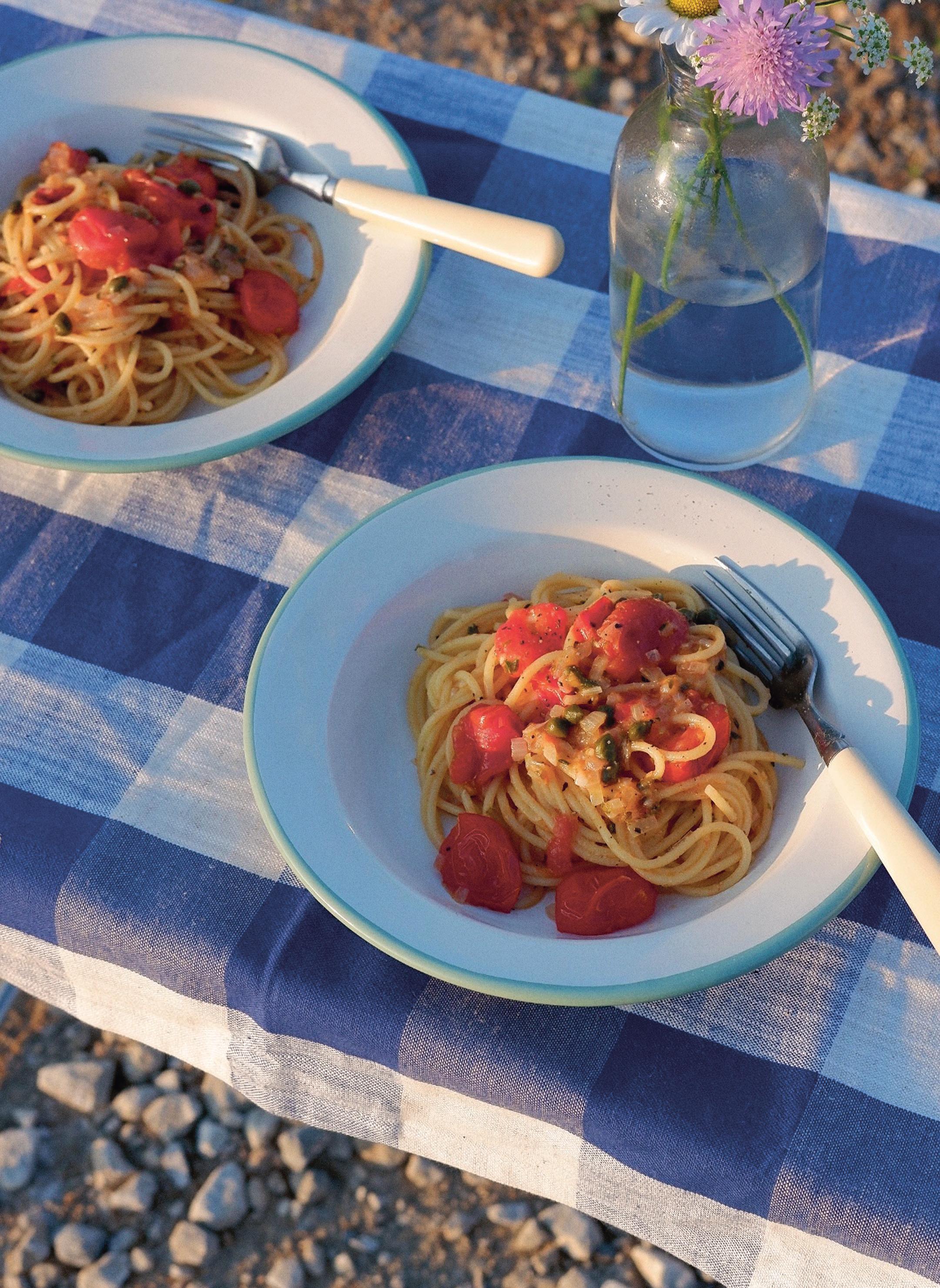 SMÖRIG SPAGETTI MED KAPRIS, OREGANO OCH FÄRSKA TOMATER
