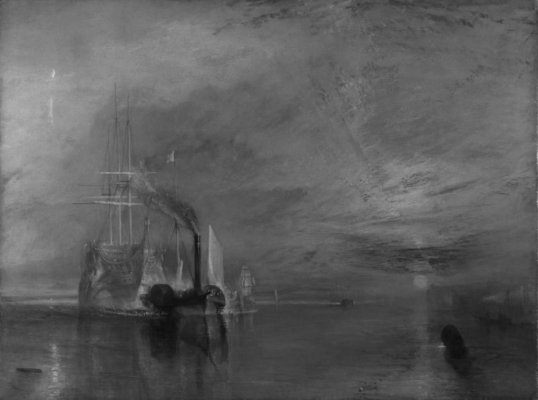 Redan vid en första betraktelse inser vi att det är något som inte stämmer. Objektet för tavlan, det gamla linjeskeppet HMS Temeraire, skymtar blott i bakgrunden. Det är inte ens placerat i mitten utan långt till vänster. Skeppet har dessutom fått en färgsättning som gör det svårt att fokusera på: det glider fram över duken i spöklika nyanser mot en dimmig fond, som en silverrelief mot himlen, mer fantasi och dröm än verklighet.