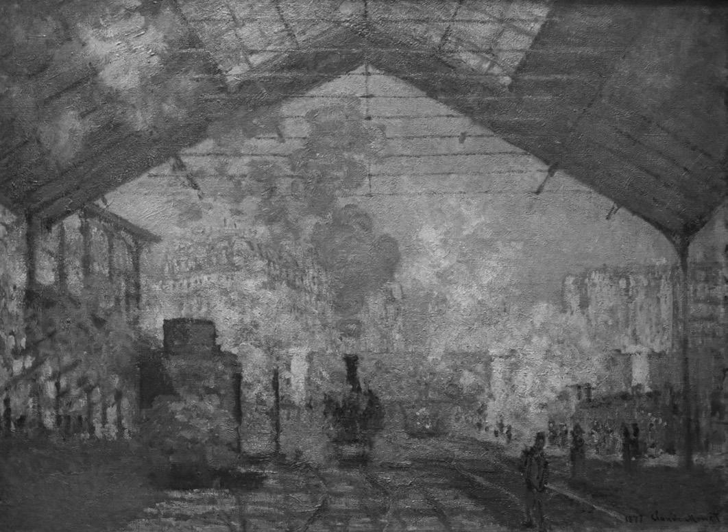 ljusår från senare konstnärers nyfikna och positivt värdeladdade utforskning av industrivärlden, allt från Claude Monets målningar av ånglokomotiv på La Gare Saint-Lazare till de radikalt modernitetsbejakande italienska futuristernas verk på 1910-talet. När Monet år 1877 skapade sina stationsmästerverk formligen vältrade han sig i samspelet mellan ljus, ånga, maskiner, rök, buller och rörelse på ett sätt som fick Émile Zola att beundrande hylla scen- och motivval (”dagens måleri: moderna scener, härligt …”). Här ryms ingen sentimentalitet, inget vemod, ty den stora revolutionen var sedan länge överstånden. Turner står ännu med ena benet i Merry Old England, men på Monets tid har industrisamhället triumferat, och för att undslippa det måste man vända tätorten ryggen och – vilket Monet förvisso gjorde – dra sig tillbaka till landsortens näckrosdammar, blomsterprakt och höstackar.