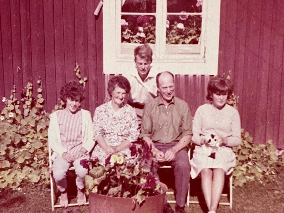 Familjen på Hatten,frv Britt-Marie, mamma, jag, pappaoch Gullimai.Kurtsaknaspåbilden.