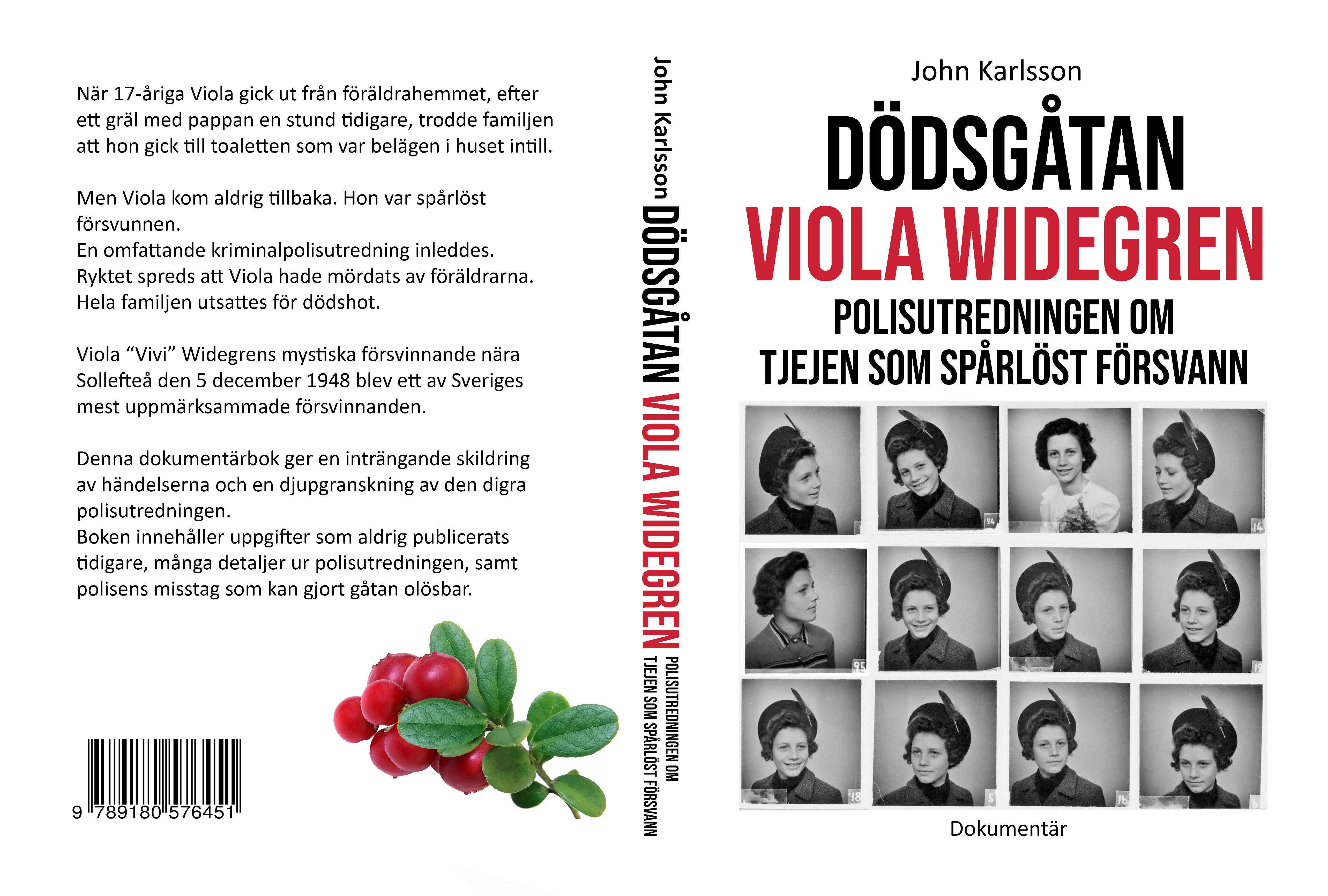 Inledningoch förord ................................................................... 9 Familjen ochViola 0-15 år ........................................................ 13 Sjuk vidlingonplockningen,Viola vägrar läkare ....................... 31 Sjukhus 2månader,”icke säkert”blindtarmen........................ 35 Falskt ryktemot Carl ................................................................. 43 Sjukhus igen,2 månader........................................................... 47 ”Jag måstehöraomnilever”, skriverViola.............................. 51 Korttidsvikariat somextra sjukvårdsbiträde............................. 57 De utländska brevklubbvännerna............................................. 63 Tideninnan Violaförsvann....................................................... 71 KvällendåViola försvann föralltid ........................................... 77 Dagarnaefter försvinnandetframtill polisanmälan................ 91 Polisutredningeninleds.......................................................... 103 Förhören medViolaslillasyster,8 år ...................................... 135 Midnattsmannen .................................................................... 161 Violas pengar.Och Carlsmark. ............................................... 167 Skospåreni snön vidälven.Timmervältan. Vädret ................ 175 Om JanneSundin.Och StureLönnerstrand............................ 185 Sökinsatsernapålandoch ivatten......................................... 191 Polisensmisstag somkan gjortgåtan olöslig.......................... 203 Violas bortglömda adresslista.Och en ny bästis .................... 217