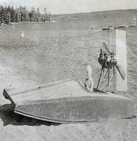Stig konstruerade också, ochbyggde, en hydrokopteroch försåg denmed en motorfrånenVolkswagen, dendånande Stig fram medpåbla de närbelägna sjöarna. En hydrokopterärenfarkost somman kanåka med både på sjön,isenoch på land.Ävenidagfinns några”båtar” igömmorna hosStig…fast ingenhydrokopter.