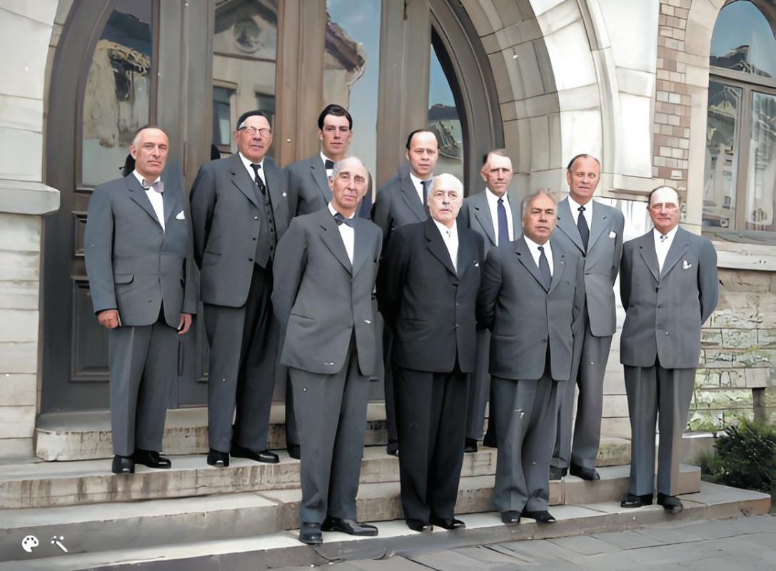 Nämndemänoch jurister vidGamla Tingshuset 29 april1959. HäradshövdingEkselli mitten ochtill vänsterKuylenstierna,Kålltorp, bakom honomKurtUllberg,Öttum.