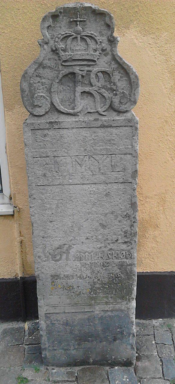 Skånes äldsta milstenfrån1668 står faktiskt på en av mina tidigare bostadsadresser, StoraVästergatan iYstad.Stenensom en gång (även förmig)visadevägen till Malmö är placerad vidden västra stadsportenoch förmodas ståpåsin ursprungliga plats.