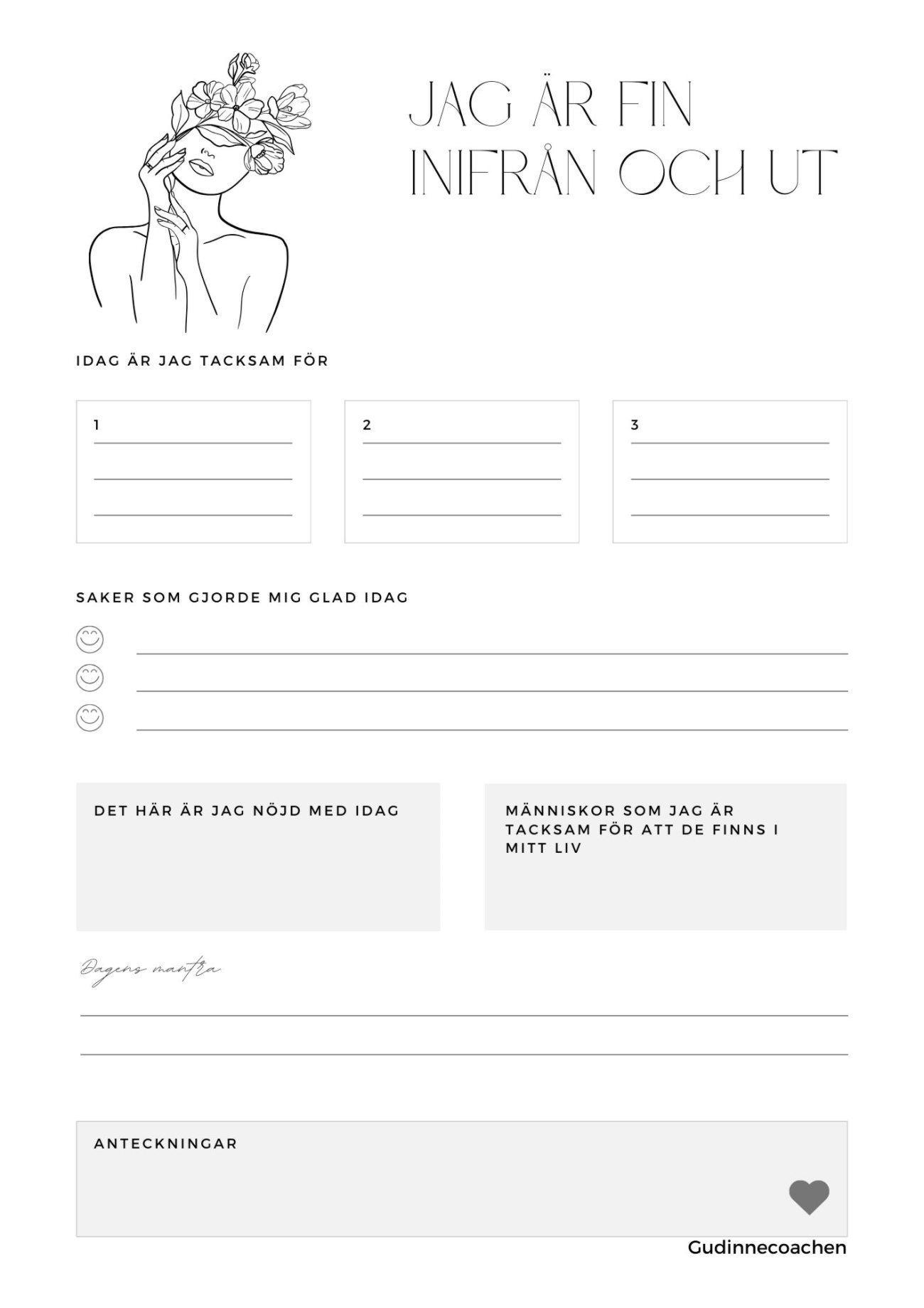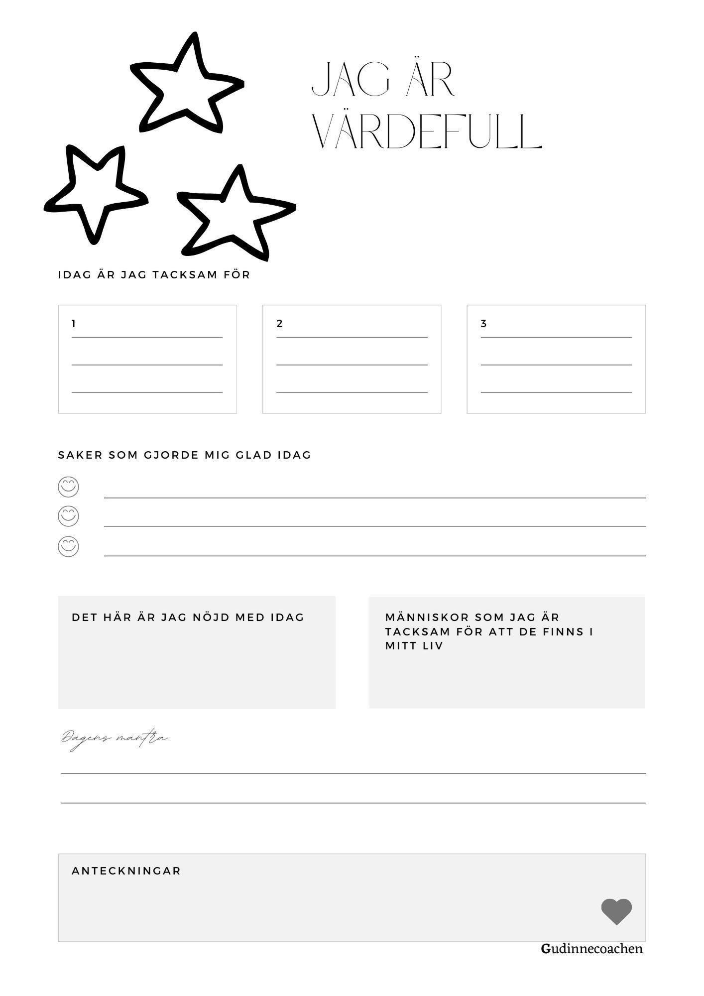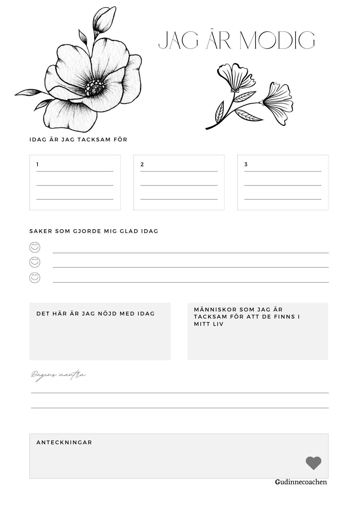Förattunderlättaarbetetmedattvaranöjdsåfårmanväldigt myckethjälpavattvaratacksam.Duharmöjlighetattfyllainågra sådanapådinareflektionsblad.Mentacksamhetslistorärnågot somhjälperdigmycketattskrivavarjedag.Därförfinnssärskilda bladfördinatacksamhetslistor.Därduskriver:Jagärtacksam för……,dufyllersjälvivaddetduärtacksamförjustnu.Denhär övningenhöjerdinenergiochhjälperdigattsesåmycketdu redanharattvaratacksamför.Jagrekommenderarattdu försökeratthittapånyasakerattskrivavarjedag.