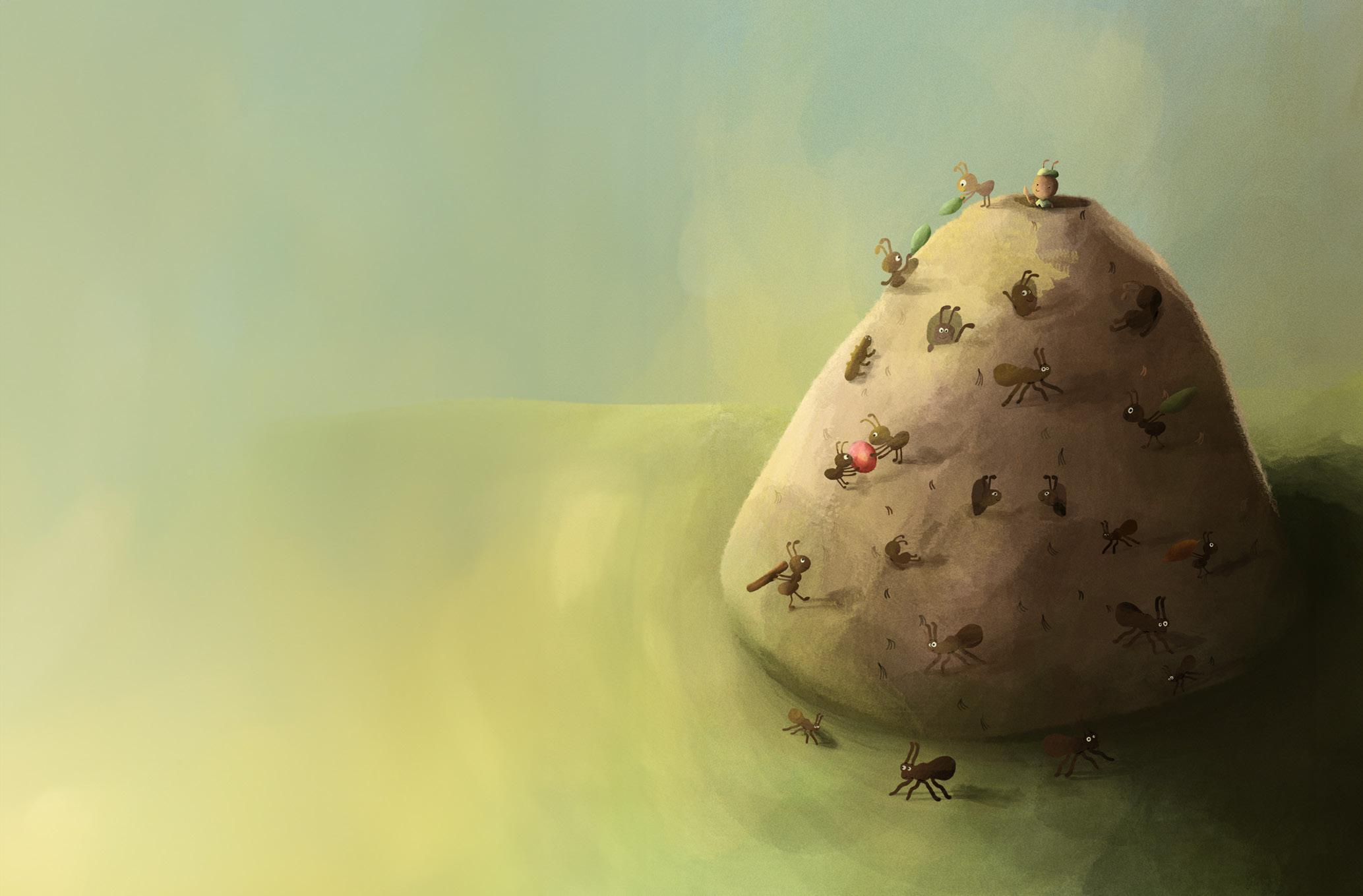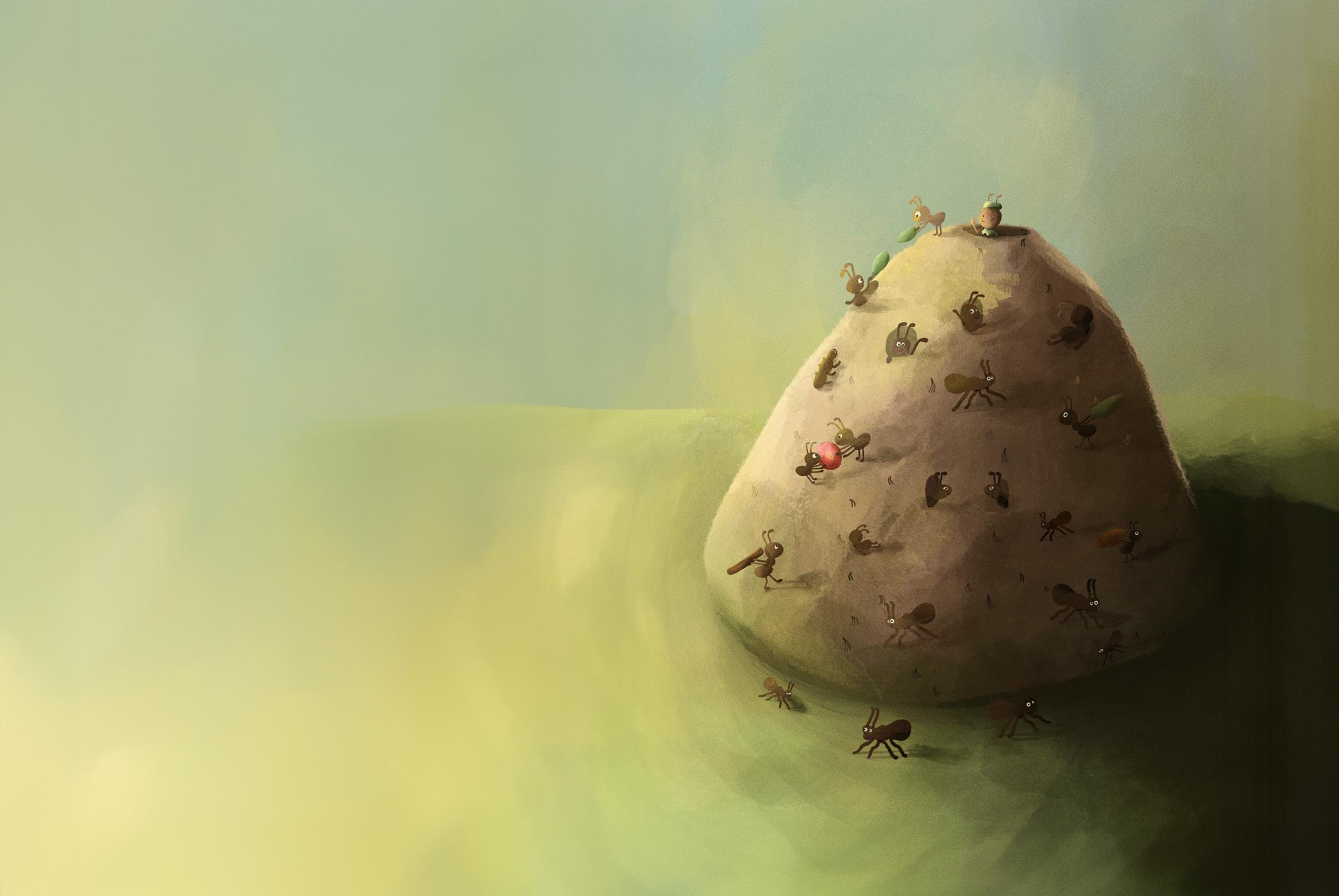 Hej, jag heter Myrre. Myror är flitiga och drar sitt strå till stacken. Men jag är inte som de andra. Jag vill hellre titta på molnen och busa.