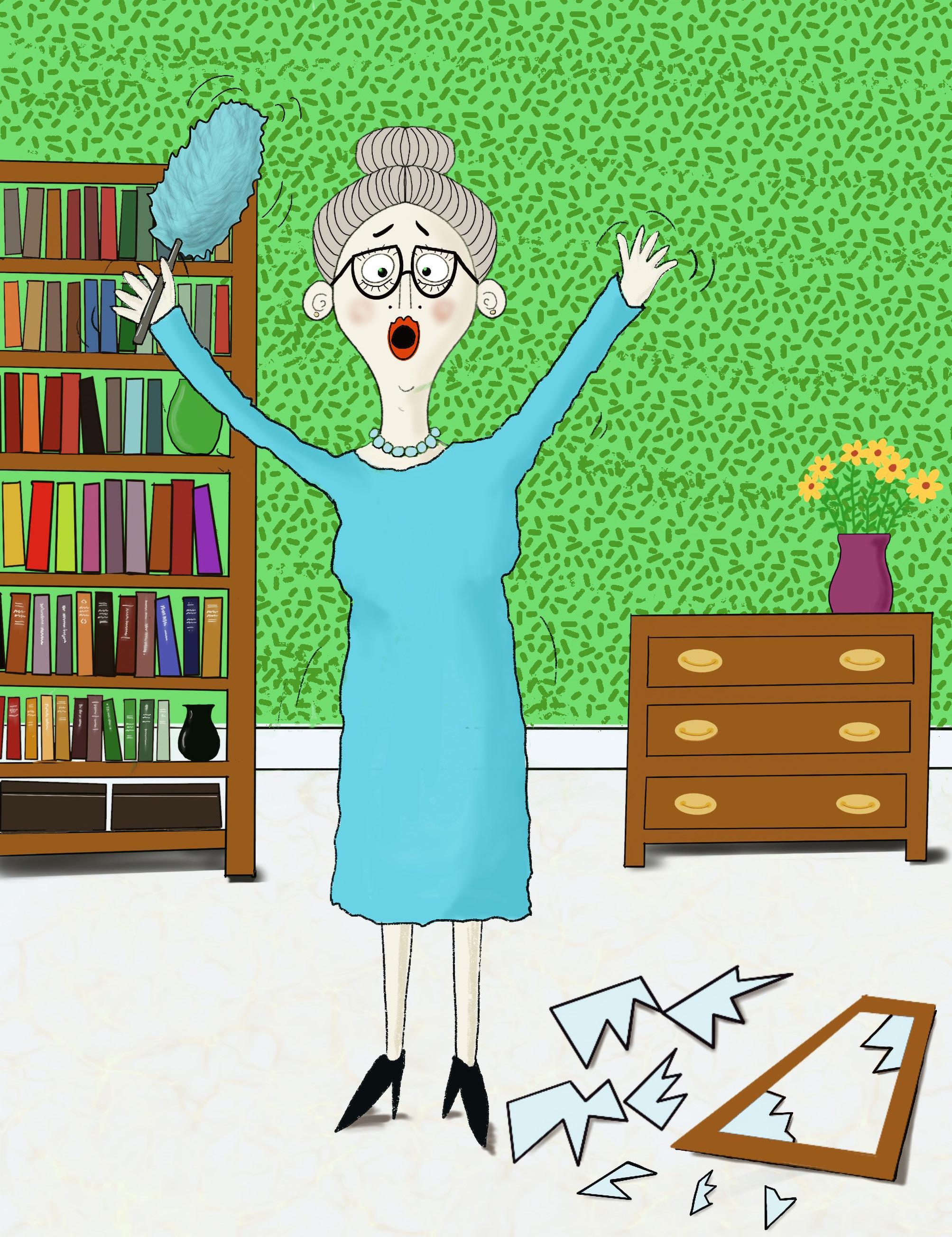 ”Oj, oj, oj … jag är verkligen en Tant Klant! Nu får jag sju års olycka”, klagade hon och skakade på huvudet.