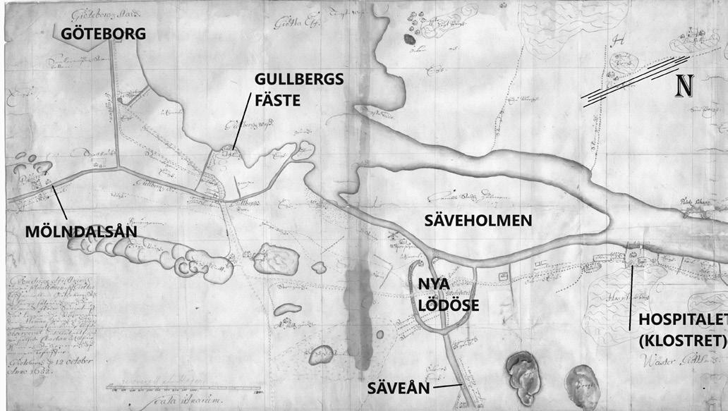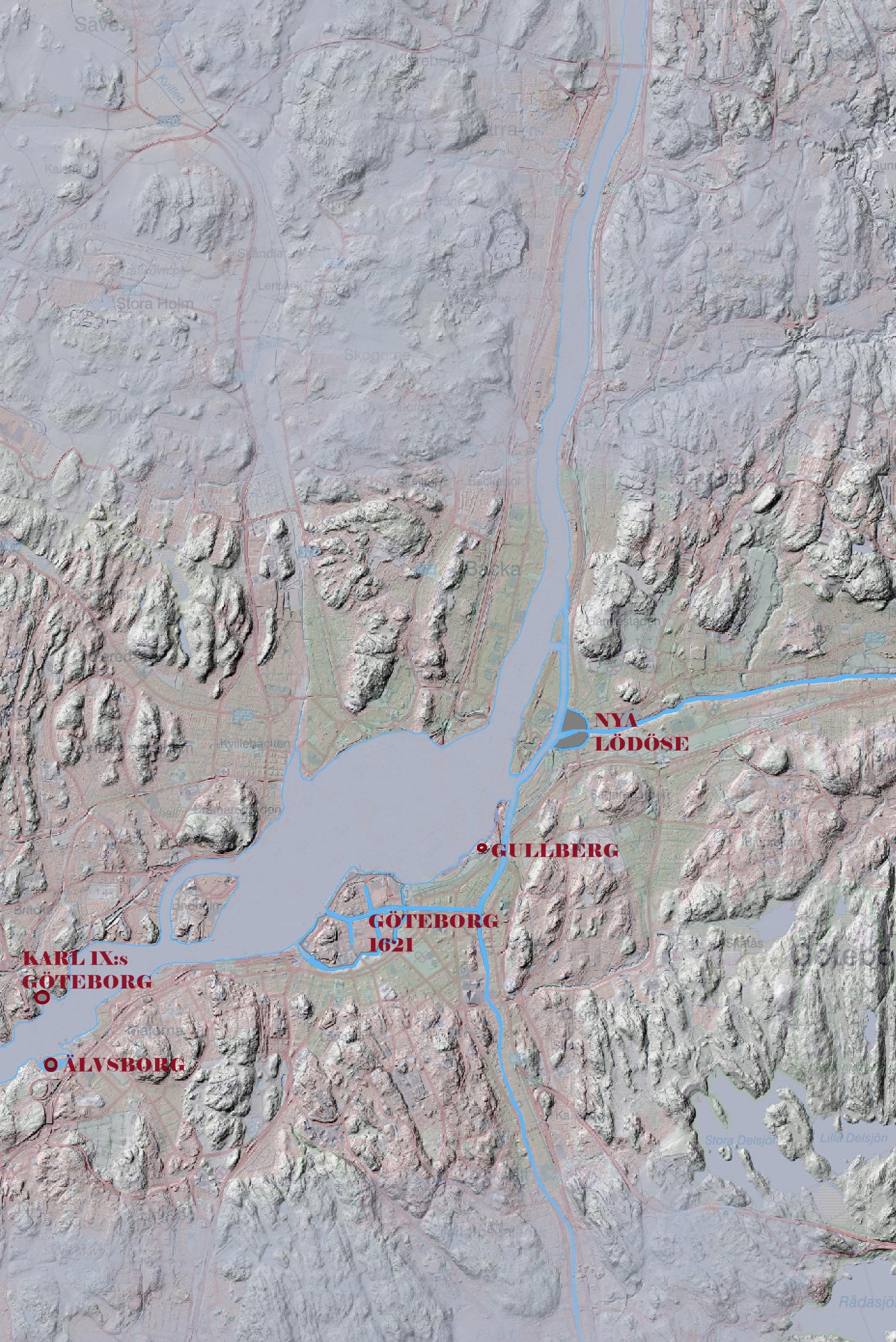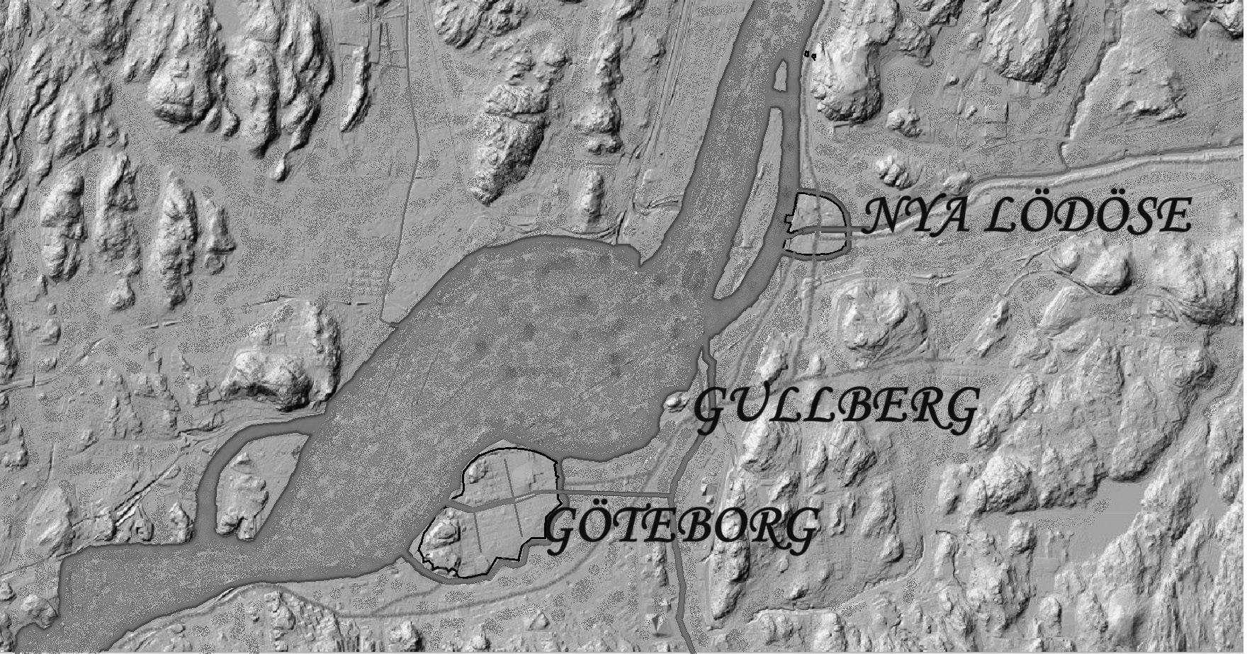 Nya Lödöse innanför vallgraven vid Säveåns mynning och Nya Göteborg några tiotals år senare. Mitt emellan dem ser vi också Gullbergs fäste (idag Skansen Lejonet).